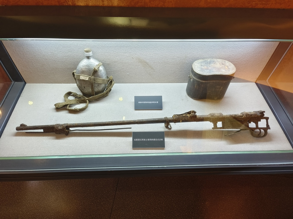 ↗周保中使用的饭盒和铝水壶、抗联战士使用的捷克式步枪。周保中(1902—1964),男,白族,云南大理人。东北抗日联军的主要创始人和东北地区抗日游击战争的主要领导人之一。1931年“九一八”事变后从苏联回国,参加抗联领导工作,1932年7月任中共满洲省委军委书记。1937年10月任东北抗日联军第2路军总指挥,与杨靖宇为首的南满和以赵尚志为首的北满抗日联军形成互为依托的“品”字游击区。1945年9月任东北人民自卫军总司令兼政治委员。新中国成立后,任云南省政府副主席、西南军政委员会政法委员会主任兼民政部长等职。