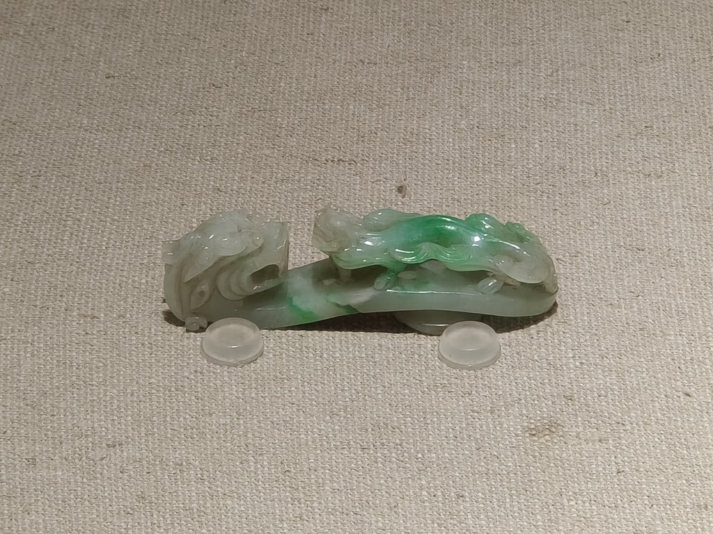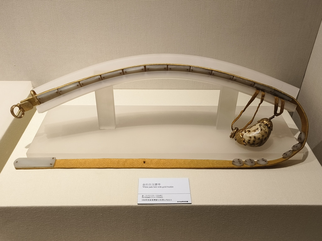 ↗金扣白玉腰带(金)。1958年出土于扶余县更新公社,由1个金扣、1个金环、1个玉铊尾、18块玉銙、69枚金钉组成。玉銙均光素无纹,带扣用黄金制成,带中间佩挂一个海螺和两枚金环。造型精美,工艺考究,是研究金代官制、服饰以及玉器制造工艺的重要实物。