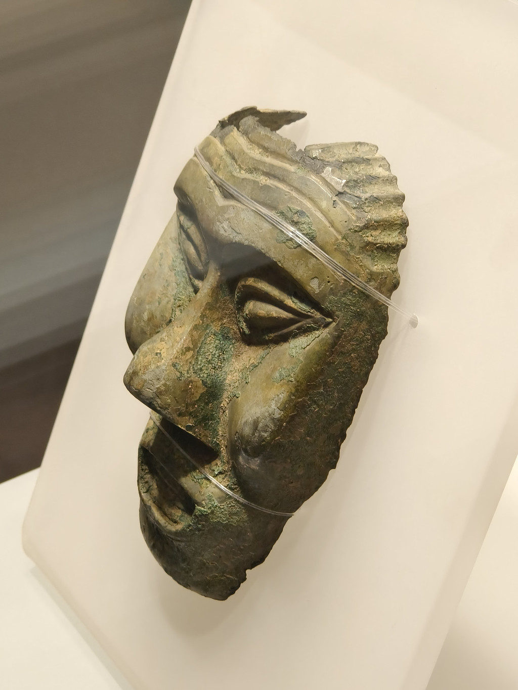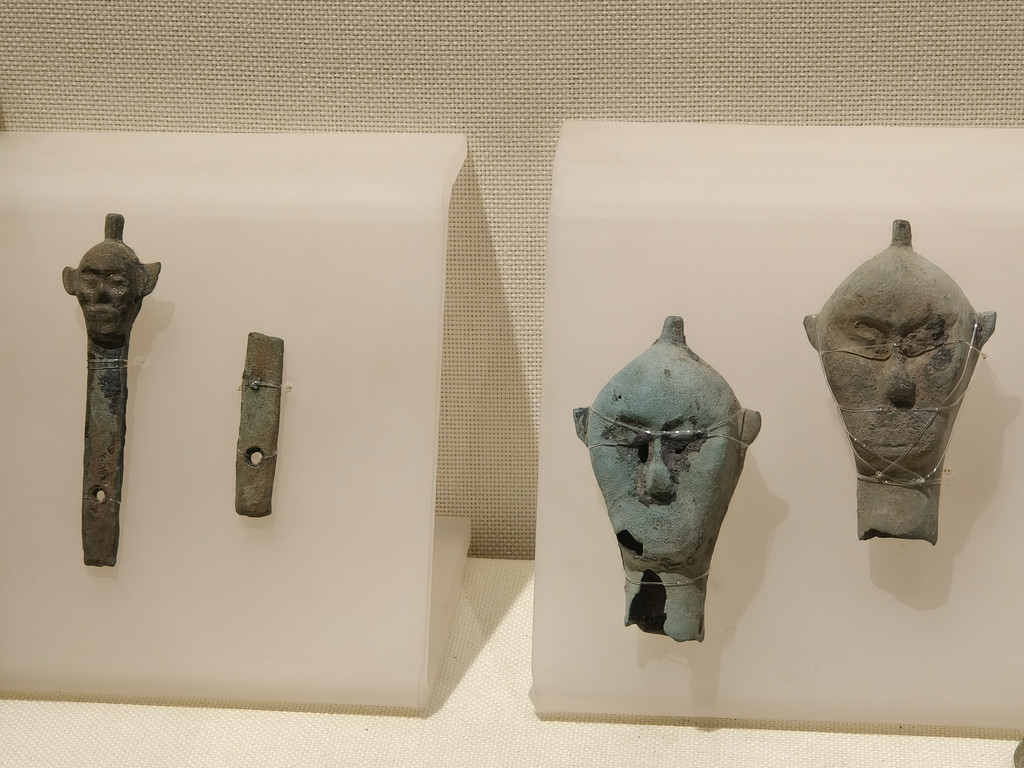 ↗人头形铜饰(扶余,公元前2世纪—公元494年)。夫余是一个古老而神秘的民族,相关文献史料较少。主要活跃在今吉林省中部及东南部地区,公元前2世纪建立政权,历经700余年,对东北地区的政治、经济、文化有所影响。