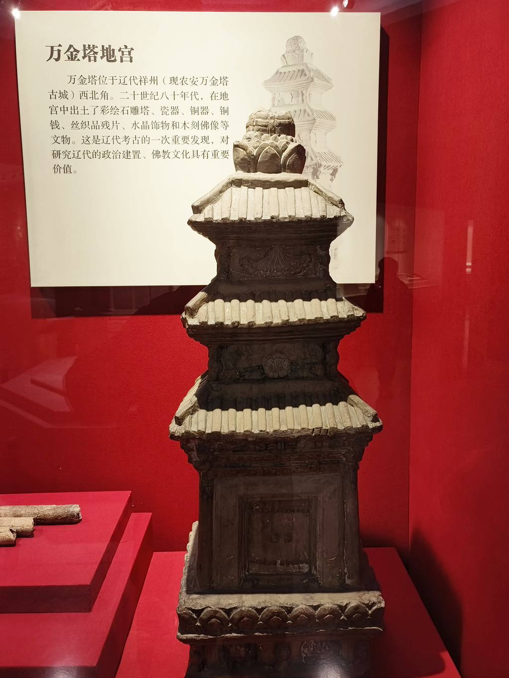↗彩绘石雕塔(辽)。残高96.5厘米、基座边长33.5厘米、宽25.8厘米,灰色砂岩雕制。实心,四角三层。绿檐红柱,雕琢精细,四面浮雕花朵、奔羊、怪兽、门扉、佛像等,并在浮雕的物体上施以红、绿、黑、白、蓝等色彩,形象生动,色彩绚丽。