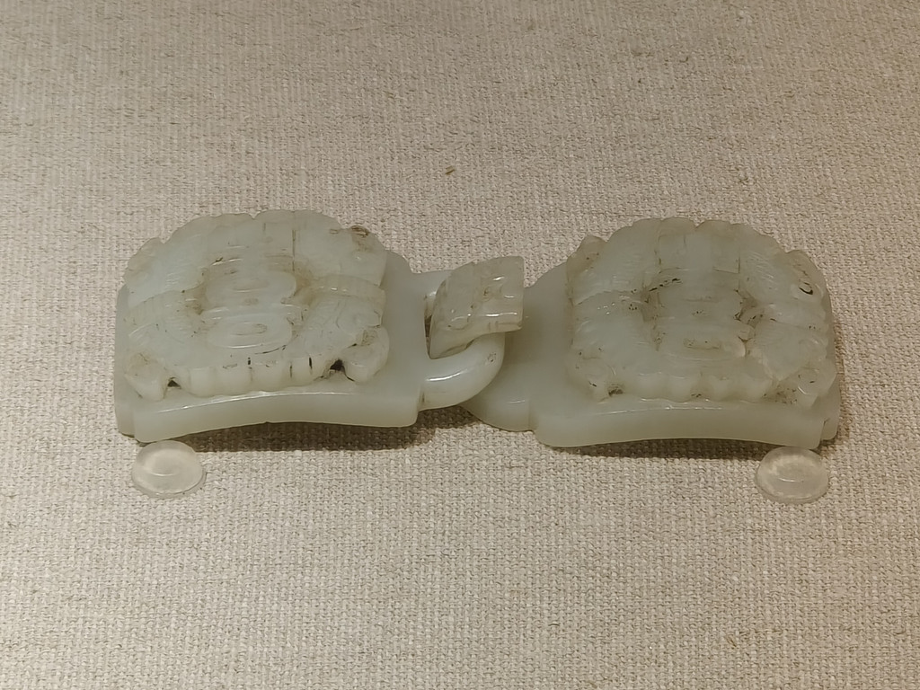 ↗浮雕双蝶喜字白玉带钩。钩首玉板和扣环玉板上的纹饰相同,中间是“喜”字,左右两侧各有相向而飞的蝴蝶,寓意喜相逢、喜上加喜。此件应为大婚所用。