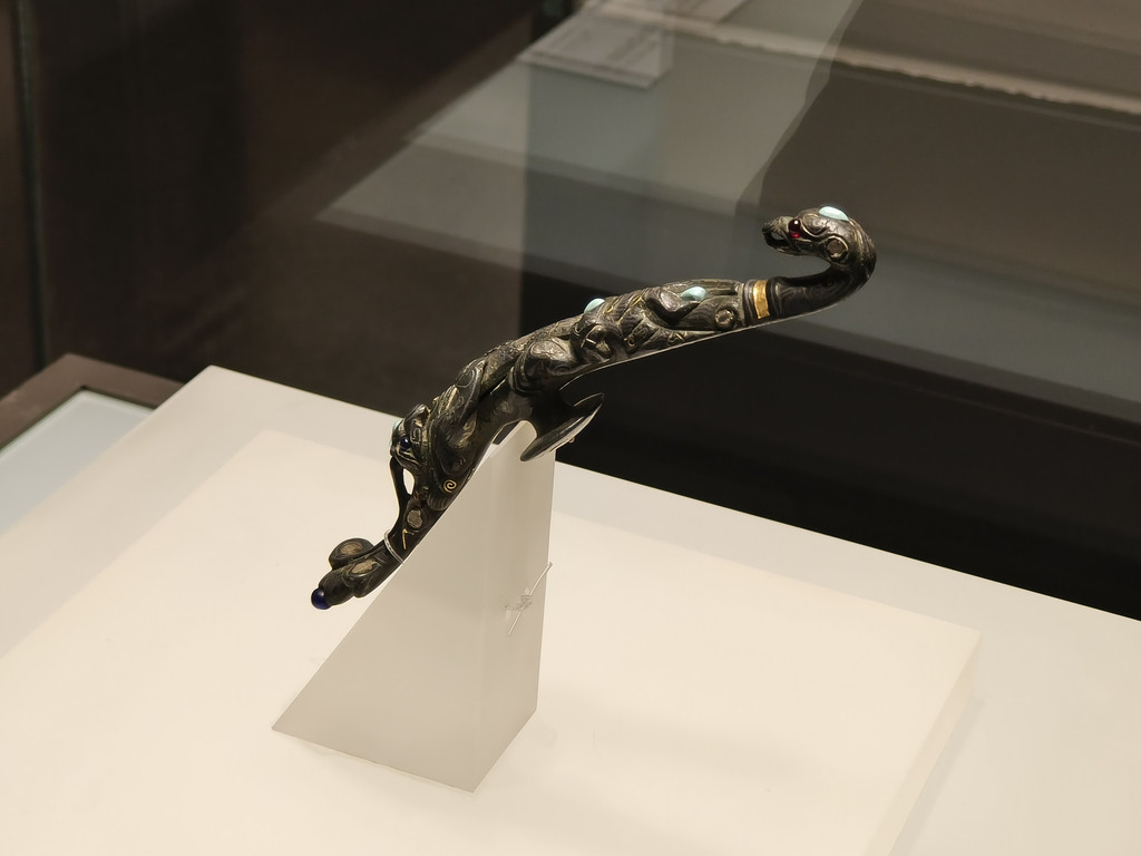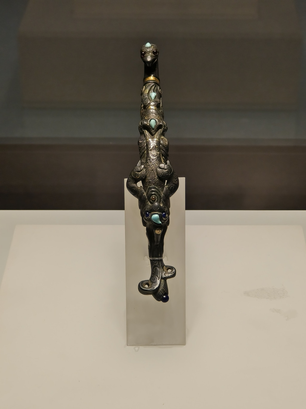 ↗错金银“丙午神钩”铜带钩(汉),镇馆之宝之一。长15.7厘米,嵌有红宝石、蓝宝石、绿松石等11颗宝石。文物正面分为三部分:首部似鹰,眼窝嵌两颗黑色玉石珠(红宝石),前额嵌一绿松石,羽用金银丝错成。钩身作鸟喙神人,眼窝嵌蓝色宝石,额镶一滴水状绿松石,双手抱鱼,鱼身通体以金丝填成鳞片。尾部作飞鸟,口含一蓝色宝石;双足、双翅卷曲向后成环形。文物背面中部有一凸起的圆钮,钮面错银,中心嵌一红宝石。上部腹面错金铭文“丙午神钩,君必高迁”八字(展品摆放位置原因,铭文看不到)。下部饰飞凤,头足错金,翅、尾和体部错银。