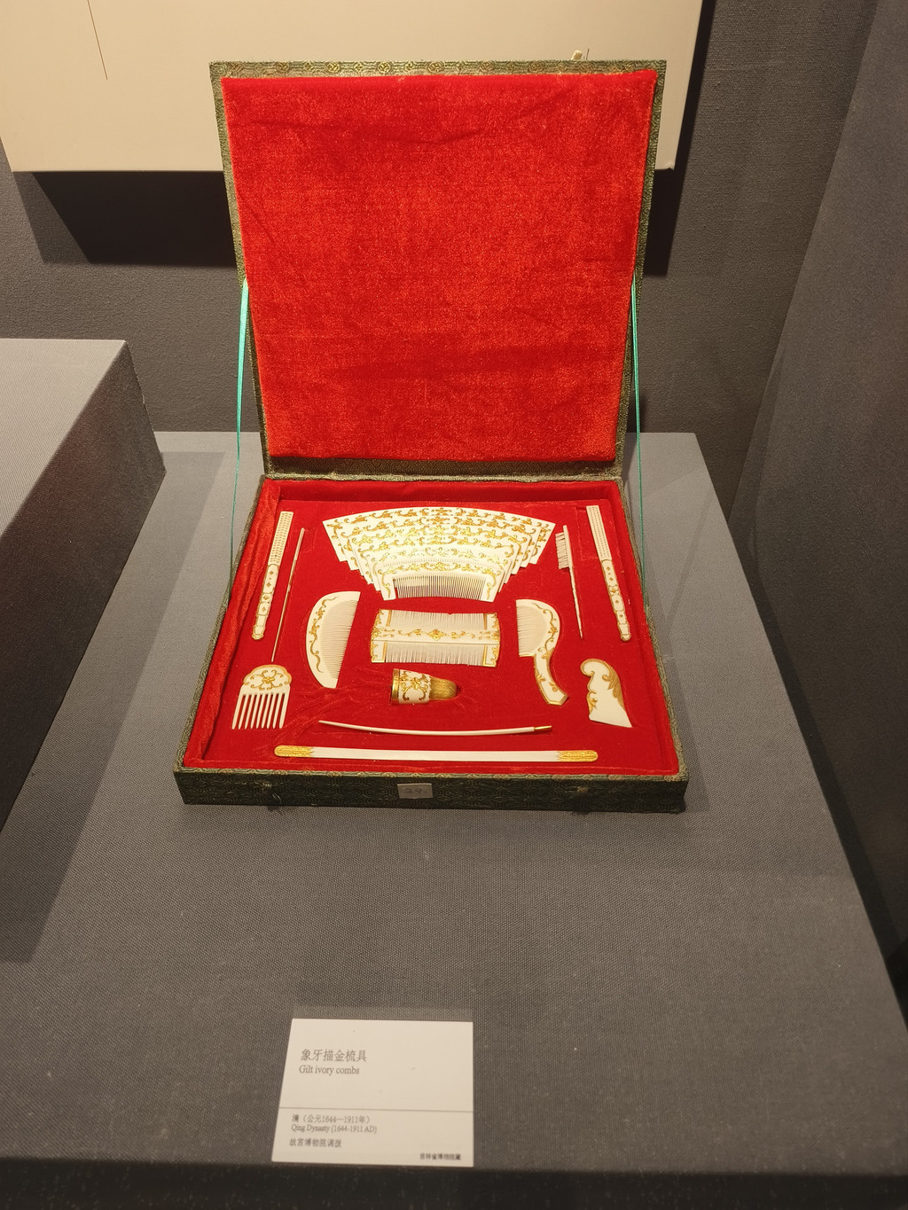 ↗象牙描金梳具(清)。这套满族梳妆匣中的梳具以象牙制成,再进行描金,可见生活的奢华。