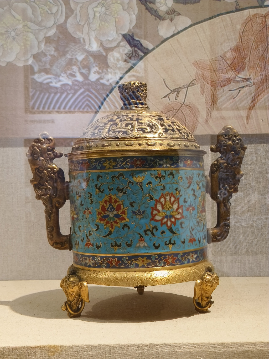 ↗透雕盖宝相花景泰蓝炉。宝相花又称宝仙花、宝莲花,是吉祥三宝(宝相花、摇钱树、聚宝盆)之一。