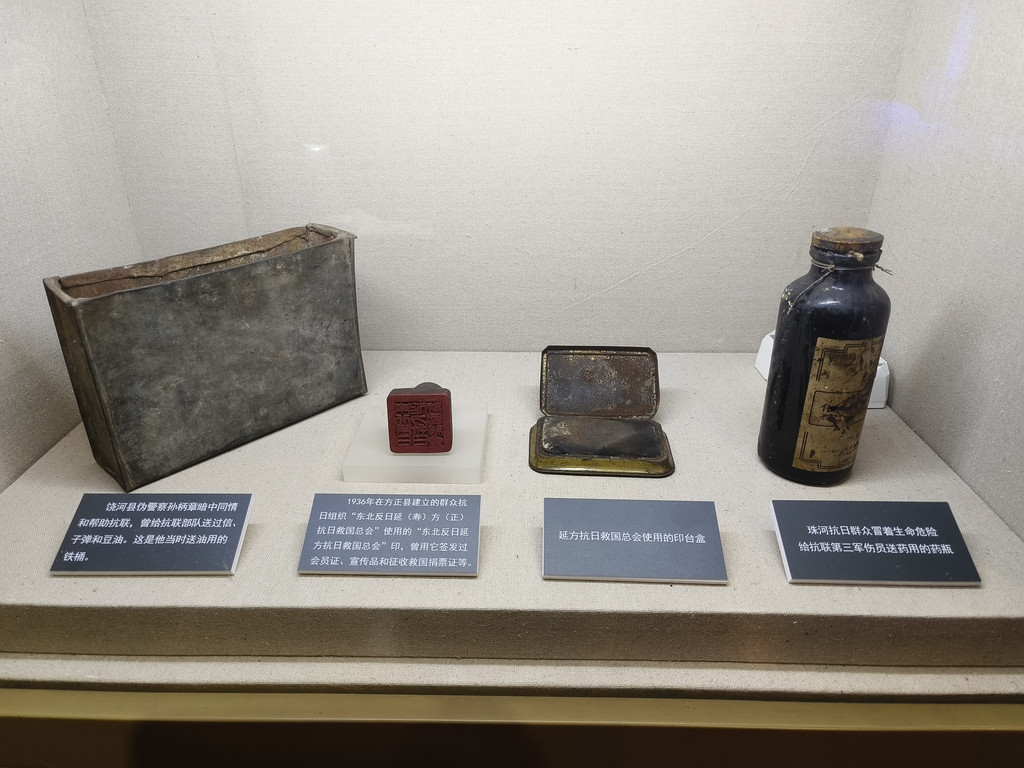 ↗群众冒险给抗联战士送油的铁桶、给伤员送药的药瓶等