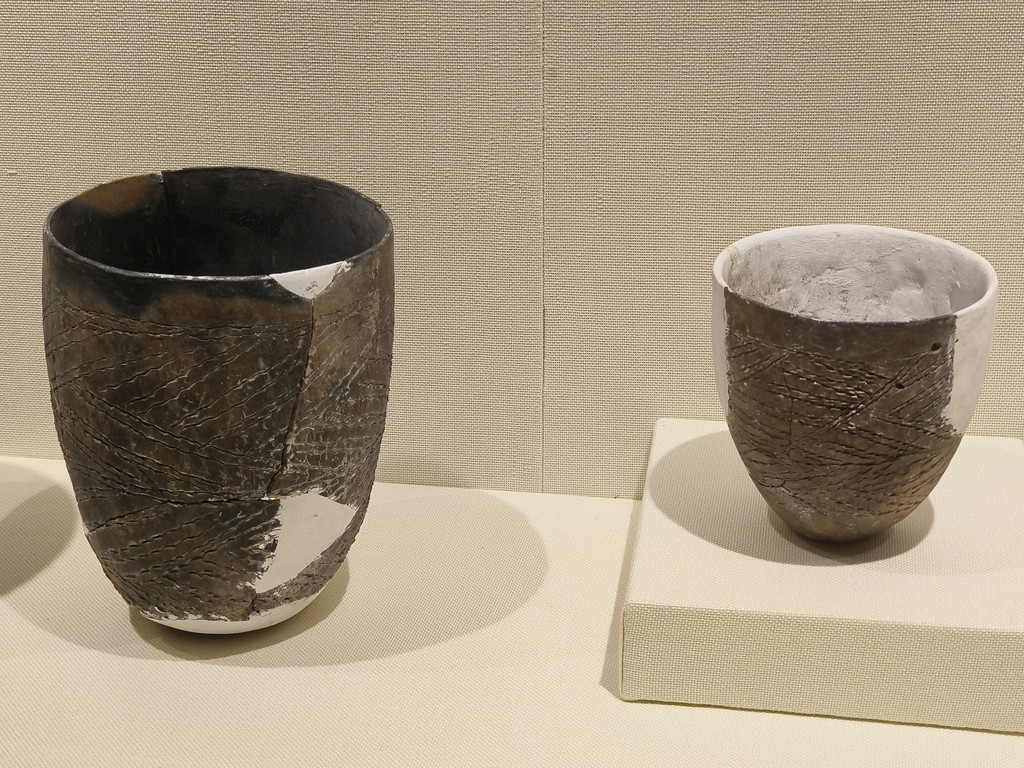 ↗刻划纹陶罐、网纹灰褐陶罐(新石器时代)