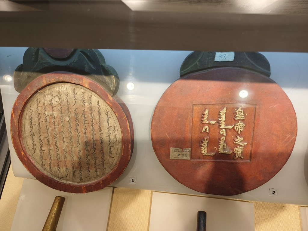 ↗努尔哈赤蒙文信牌、皇太极“皇帝之宝”信牌(清)。信牌是皇帝发布命令、传递诏谕的信凭物。