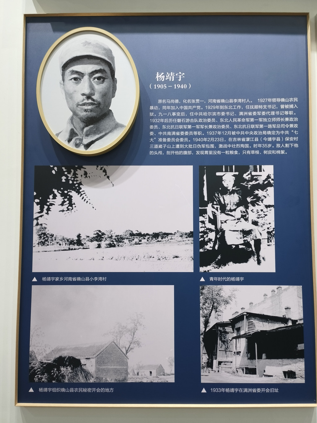 ↗杨靖宇(1905—1940),男,原名马尚德,河南确山人,中共党员,抗日英雄,鄂豫皖苏区及其红军的创始人之一,东北抗日联军的主要创建者和领导人之一。1932年受党中央委托到东北组织抗日联军,任抗日联军总指挥政委等职,在白山黑水间带领东北军民进行了艰苦卓绝的战斗。1940年2月23日,在弹尽粮绝的情况下牺牲于吉林省濛江县(今靖宇县),年仅35岁。日寇残忍解剖了他的遗体,发现胃里只有枯草、树皮和棉花。1942年,在中共中央尚不能最后确认他已牺牲的情况下,被推举担任东方各民族反法西斯大会名誉主席团委员,一起被推举担任这一职务的只有毛泽东和朱德。2009年9月被评为“100位为新中国成立作出突出贡献的英雄模范人物”之一。2014年9月被列入民政部公布的第一批300名著名抗日英烈和英雄群体名录。
