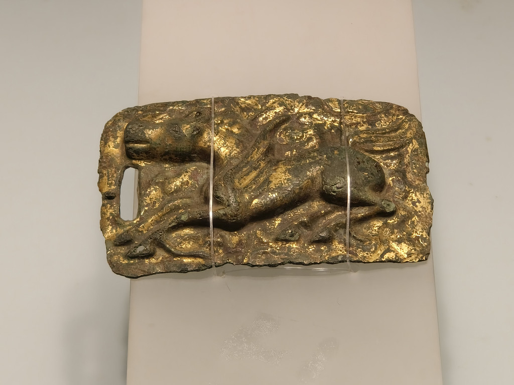 ↗鎏金神兽铜牌饰(扶余)。正面铸一形如飞马的神兽,吻部作弯角上翘,形似犀牛。昂首扬尾,四蹄腾空,双翼伸展,作奔翔状。