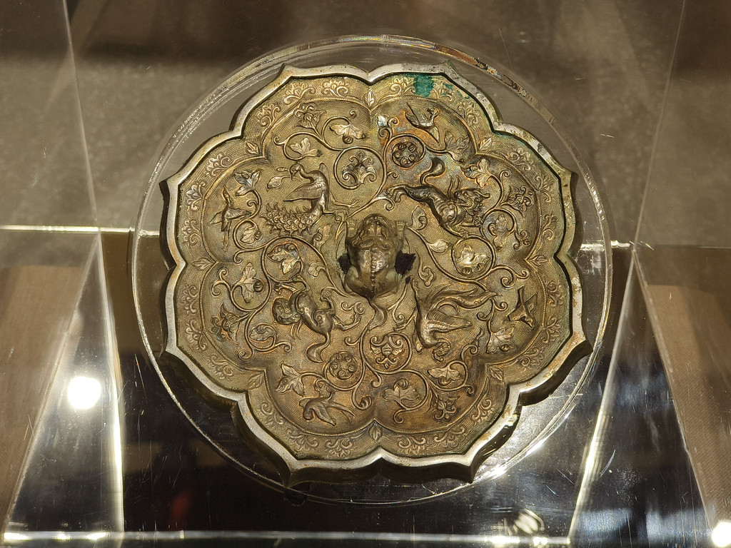 ↗菱花形嵌银鎏金珍禽瑞兽铜镜(渤海)。整体呈菱花形,镜背边缘隆起,缘内嵌有菱花形银片,银片内有浮雕式瑞兽,奔走嬉戏于枝蔓之间。