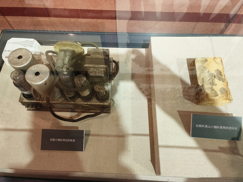 ↗抗联小分队使用的电台、朴英山小部队使用的密码本。国家一级文物。1985年8月29日发现于牡丹江市东宁绥阳林业局寒葱河作业区的一处岩石缝里。当时电台装在用五层胶合板钉成、防雨布裹着的小木箱中,有收报机、发报机、电键盘、天线、耳机及修理用具,还有一本伪满康德六年出版的小字典《标准注音学生国音字汇》,上面写有中文“朴英山”和俄文“朴英山字典”字样。