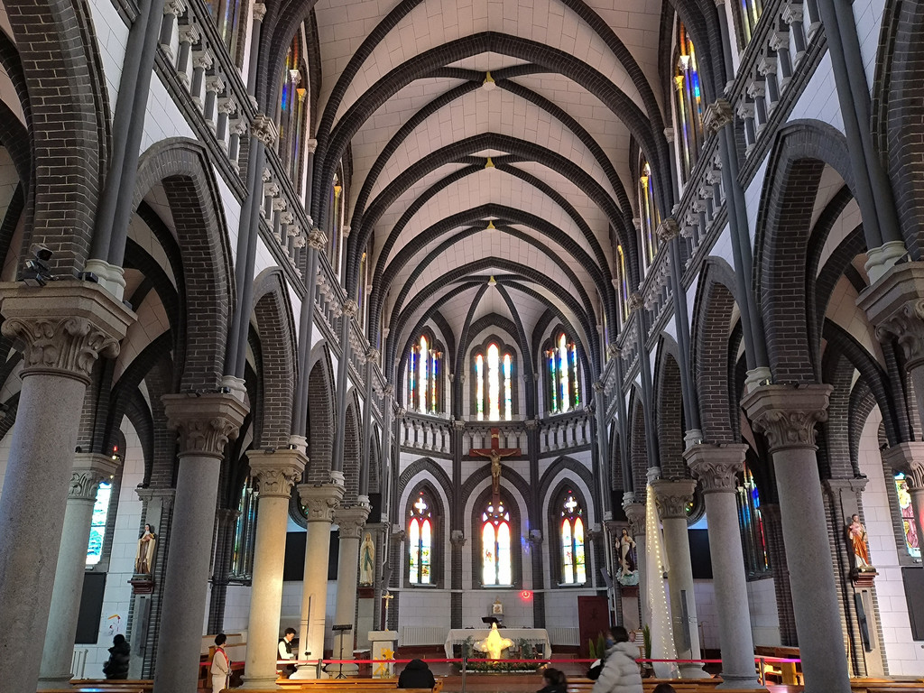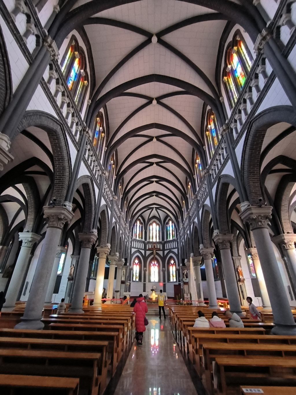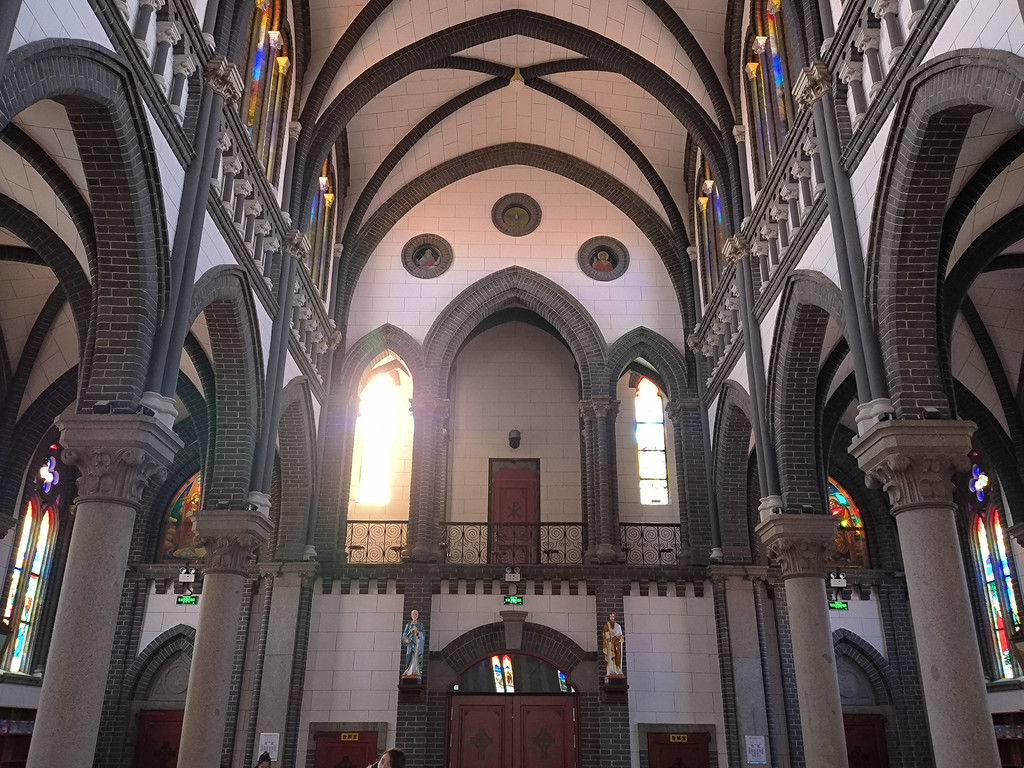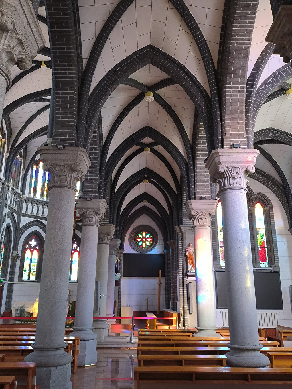 我们从右侧的小门进入,内有16根圆形大石柱,每根高28米,采用从阿石哈达采集的青石,凿成不同规格组合的石座、石柱,雕以花纹图案相配而成。教堂设5座祭台,其中正祭台为凿石雕刻而成,有7尊石膏塑像,做工细腻,雕刻精致,此外还有忏悔室、跪椅等,墙上是44扇圣经人物和福音故事的彩绘玻璃窗,穹顶造型优美,曲线玲珑,此教堂曾是吉林市的地标,现为全国重点文物,每逢礼拜日或天主教节日,钟声清悠,绵延数里。