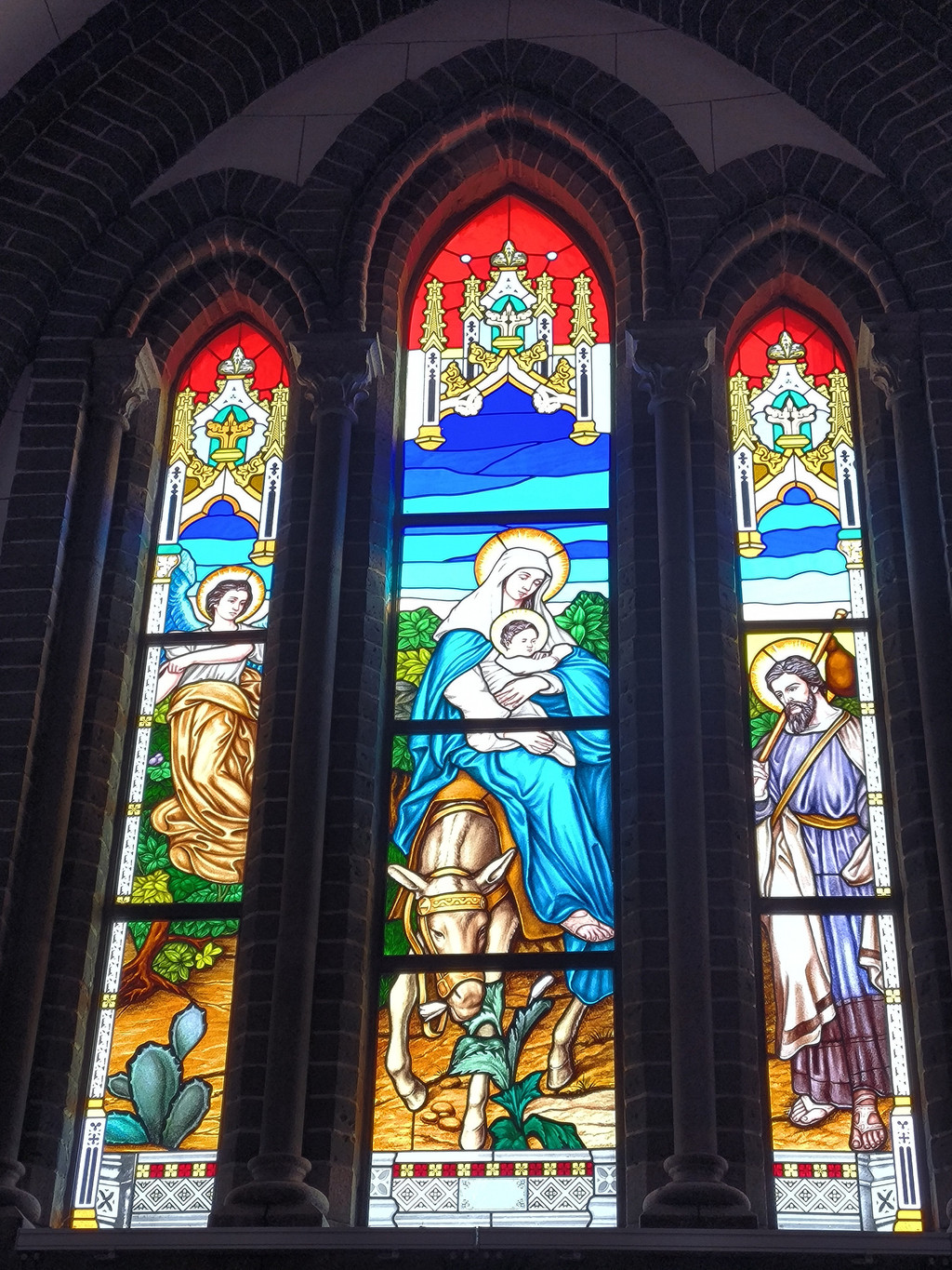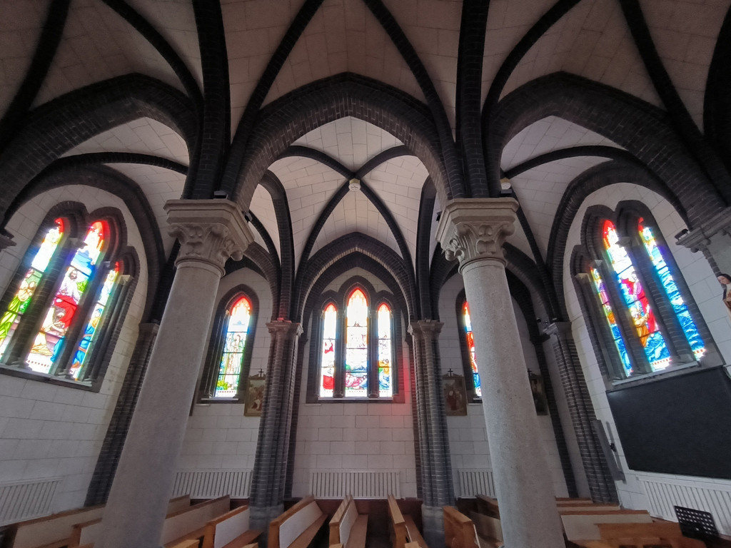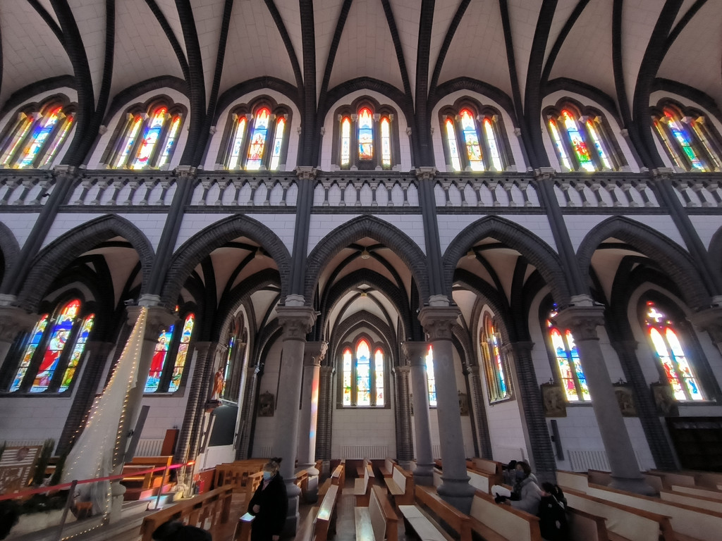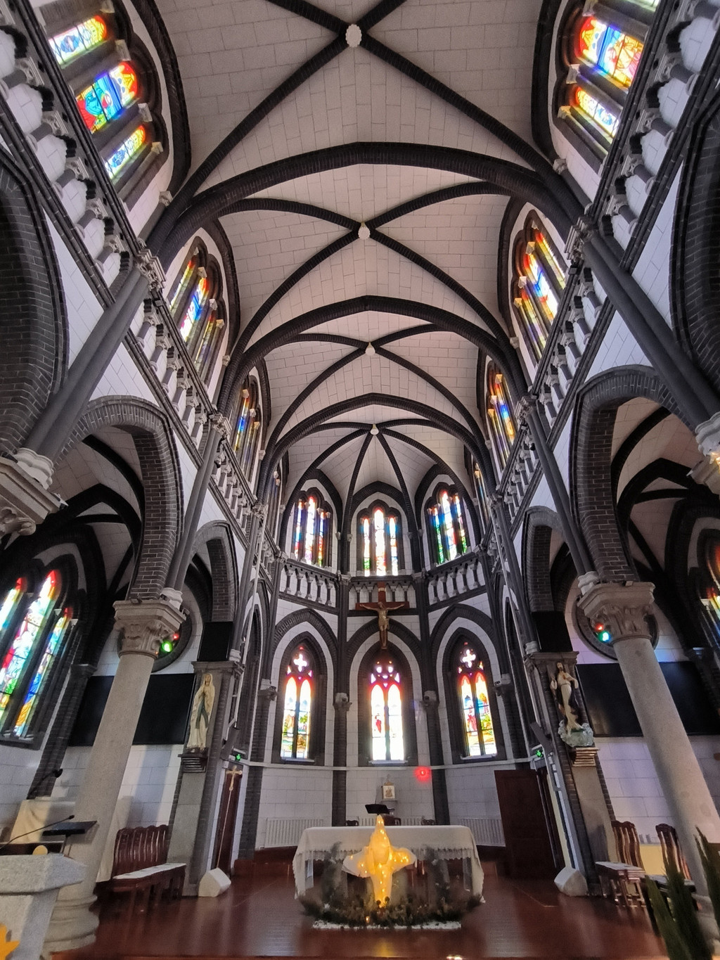我们从右侧的小门进入,内有16根圆形大石柱,每根高28米,采用从阿石哈达采集的青石,凿成不同规格组合的石座、石柱,雕以花纹图案相配而成。教堂设5座祭台,其中正祭台为凿石雕刻而成,有7尊石膏塑像,做工细腻,雕刻精致,此外还有忏悔室、跪椅等,墙上是44扇圣经人物和福音故事的彩绘玻璃窗,穹顶造型优美,曲线玲珑,此教堂曾是吉林市的地标,现为全国重点文物,每逢礼拜日或天主教节日,钟声清悠,绵延数里。