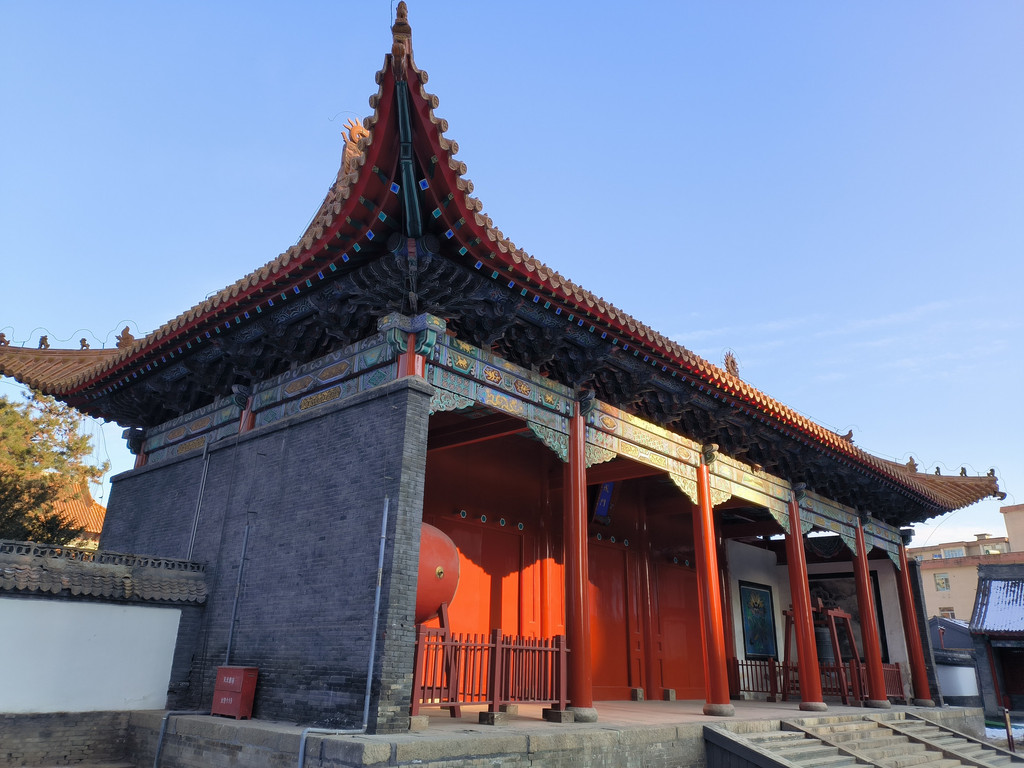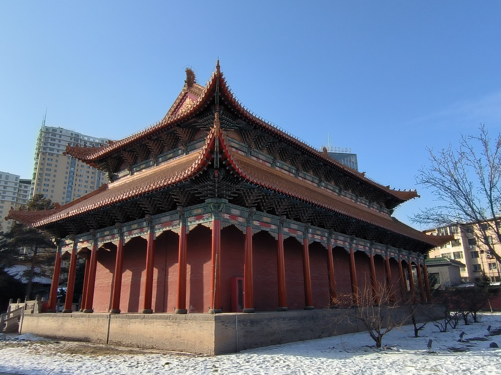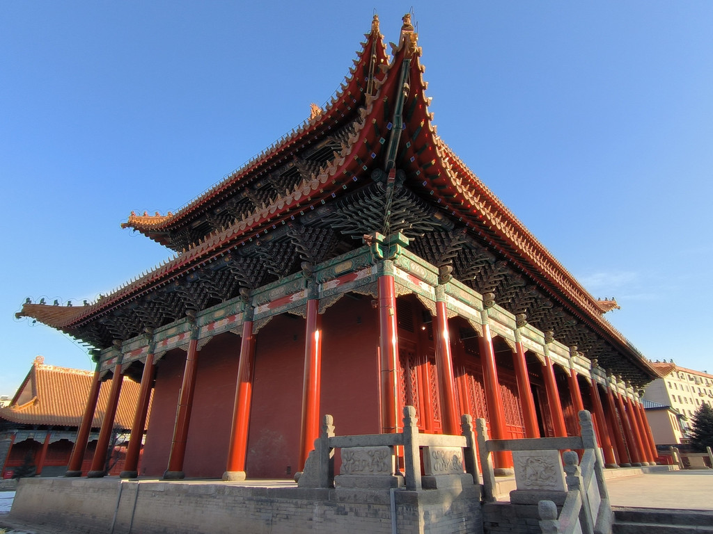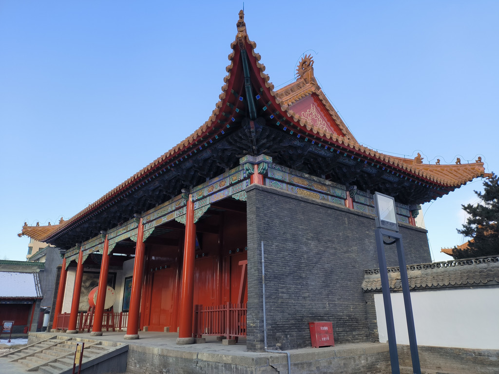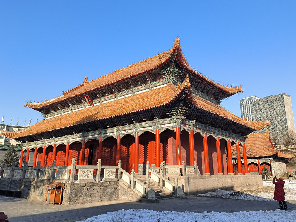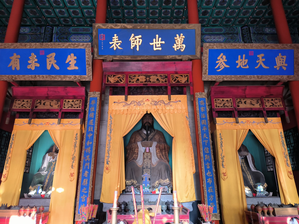 大成殿位于第二进院落的正中,是全庙的中心建筑,面阔11间,东西长36米,南北宽25米,高19.64米,双重飞檐,歇山式庑殿顶,雕梁画栋,金碧辉煌,殿内正中供奉“大成至圣先师孔子之神信”朱地金字牌位,两侧分别供奉孔子弟子—“四配”和“十二哲”牌位,最后的崇圣殿位于第三进院落,为是孔子家庙,供奉孔子五代祖牌以及历代衍圣及夫人绢质绣像。可能是由于我们来得较早,加上气候寒冷,文庙里空无一人,