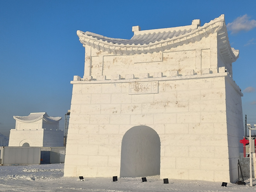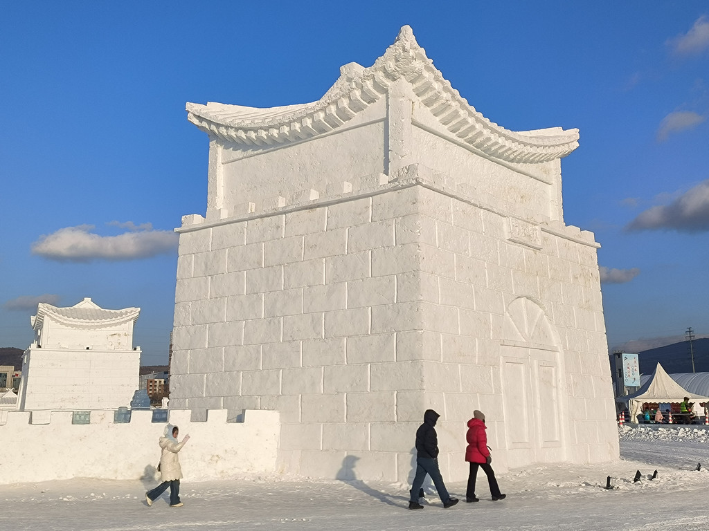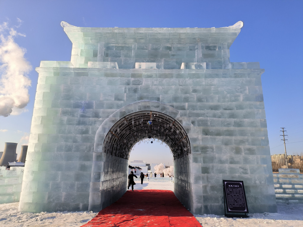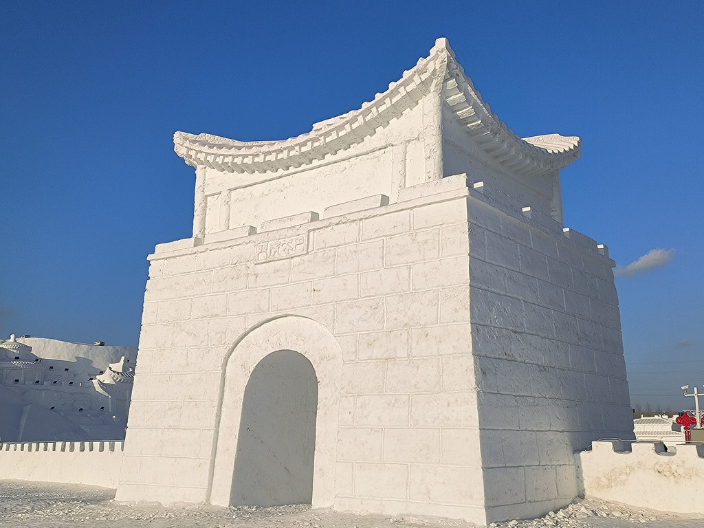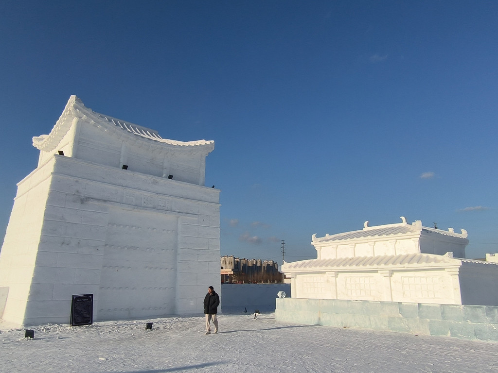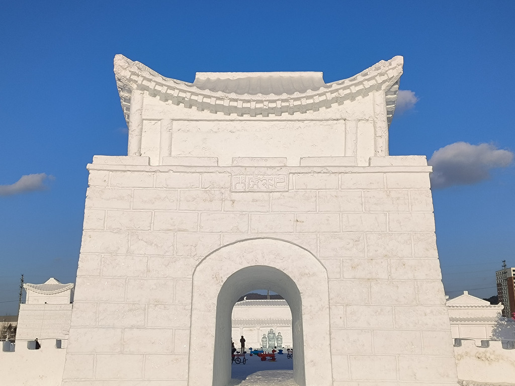 下午我们在吉林站西广场乘免费专线车,前往吉林高新区的冰雪乌拉城,吉林市的冰雪文化源远流长,此项目正是这一文化传统的现代延续,乌拉城总占地20万平方米,建造所需的雪量高达3万立方米,而冰量则为6000立方米,城中有13处大型冰雕,包括冰城门、冰滑梯以及10处小型冰雕,还有雪滑梯和雪城墙,其规模和项目虽然与哈尔滨无法相提并论,但也有自已的特色和风格,这些雪雕以独特的艺术表现形式,重现1898年吉林城的历史风貌,包括八大城门、文庙、打牲乌拉总管衙门、官参局、和将军府等建筑。