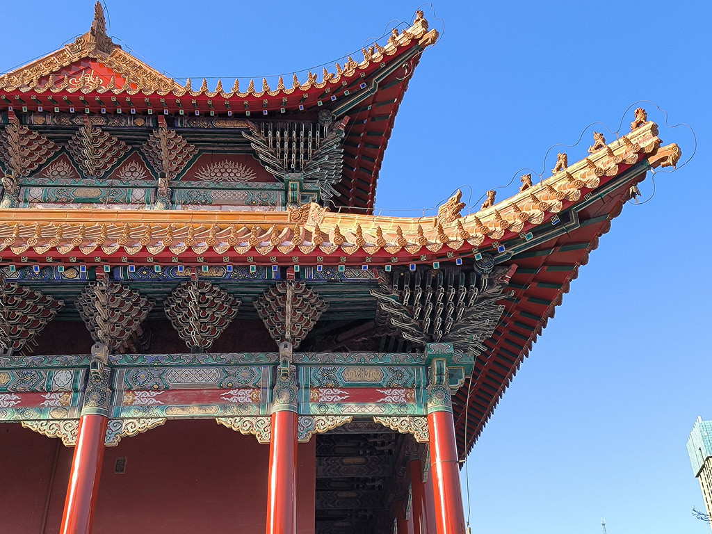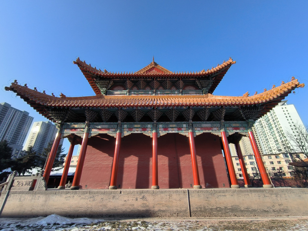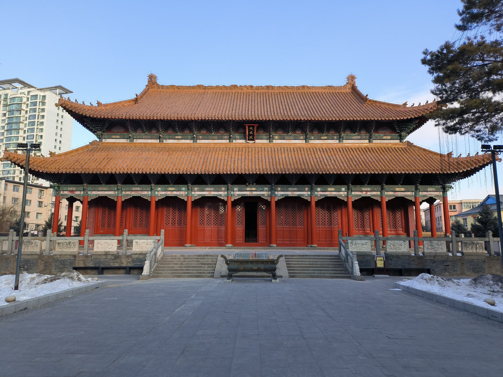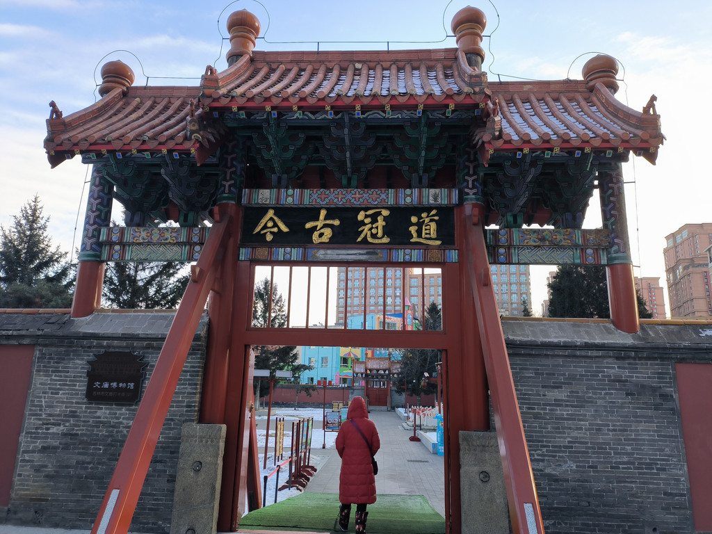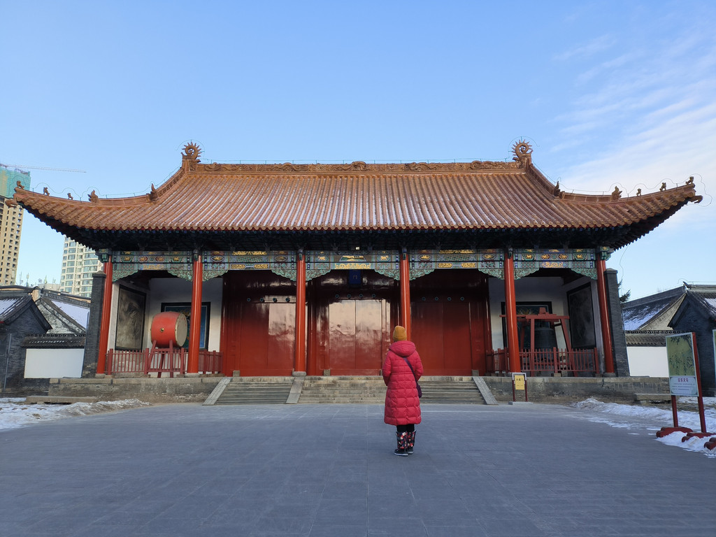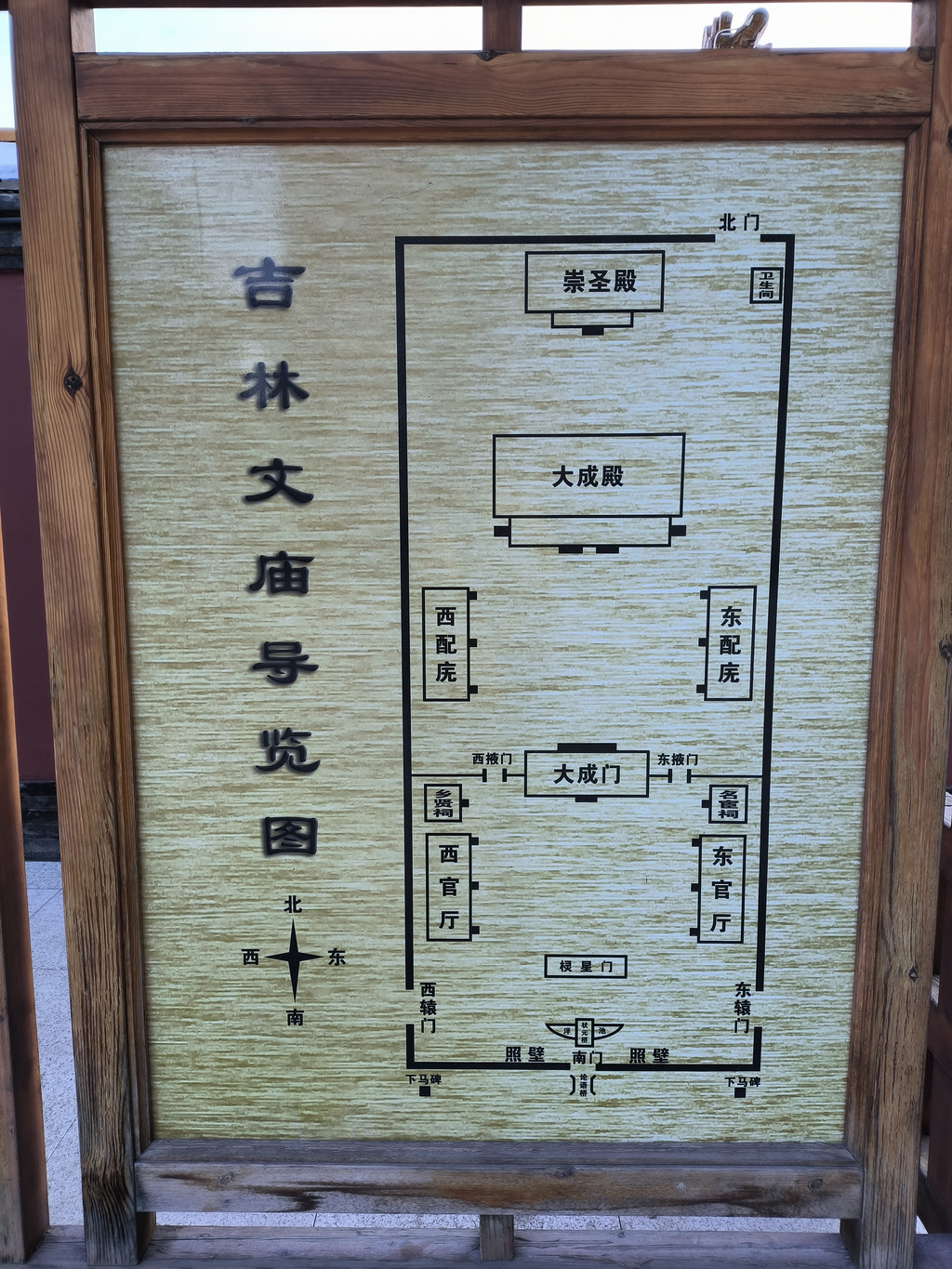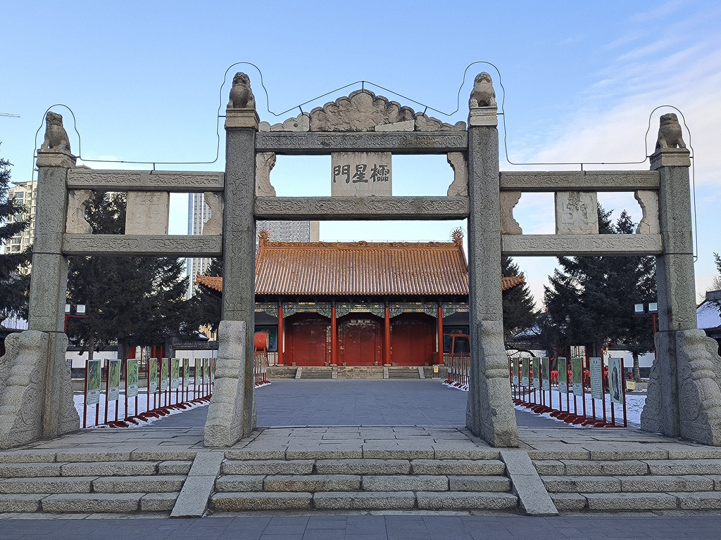吉林文庙位于昌邑区文庙胡同,东西宽74米,南北长221米,占地总面积16354平方米,有殿堂配庑64间,大成门、大成殿、崇圣殿3大主体建筑构成三进院落,坐落在南北向的中轴线上,两侧辅助性建筑呈对称状排列,四周由3米高红墙环绕,整个文庙红墙黄瓦,殿宇轩昂,富丽堂皇,正门前院外最南面的垣墙称照壁,此墙比其余三面高大坚厚,长30米,高5米。据说当地不出状元不能将照壁辟为大门,因吉林文庙落成后已废除科举,所以清至民国年间一直没有开辟正门,人们进出文庙只能走东西辕门。我们从西侧小门进入,门上横额“道冠古今”为吉林提学使曹广桢所题,中轴线建筑次序依次是状元桥、棂星门、大成门、大成殿、崇圣殿,