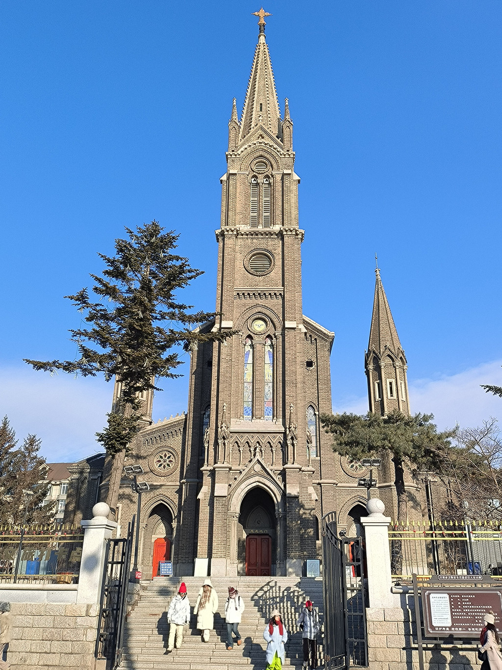 光绪三十一年(公元1905年)后吉林教区由巴黎外方传道会主持。此教堂于1917年动工,费时10年于1926年落成,名为耶稣圣心堂,主体由教堂和钟楼组成,平面略呈“十”字形,全部为砖石拱形建筑,单脊瓦屋面,无木梁或木柱,正面有三门,两边立有圣母玛利亚等雕像。我们从右侧的小门进入,内有16根圆形大石柱,每根高28米,采用从阿石哈达采集的青石,凿成不同规格组合的石座、石柱,雕以花纹图案相配而成。