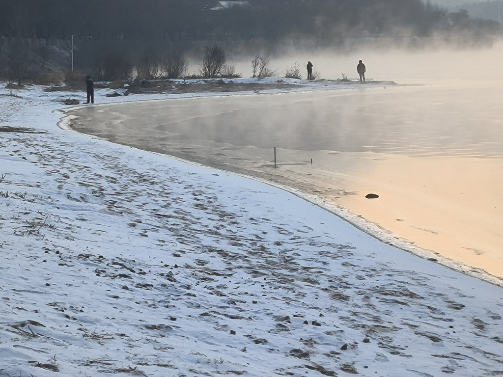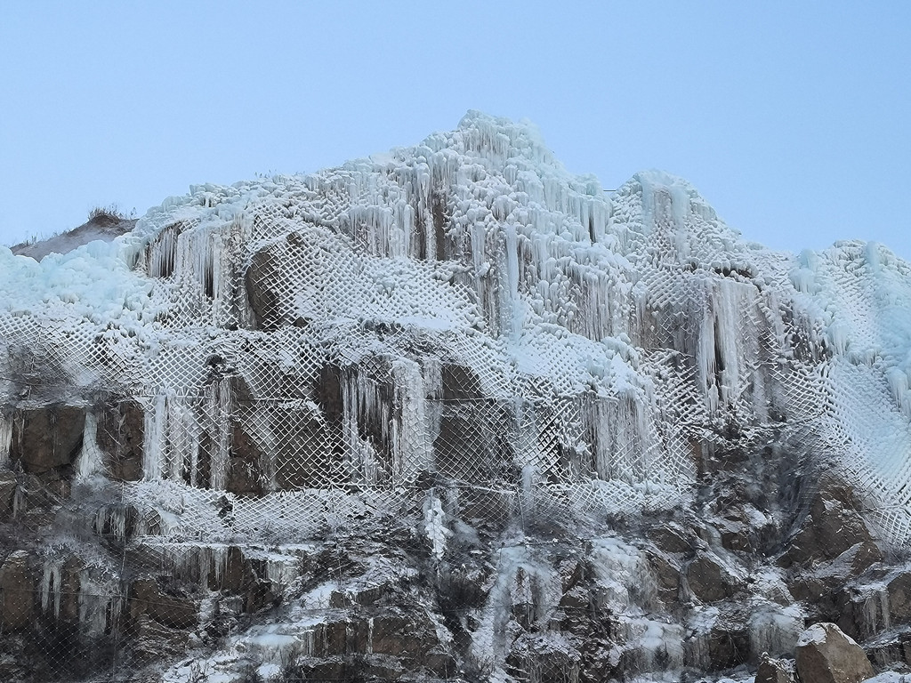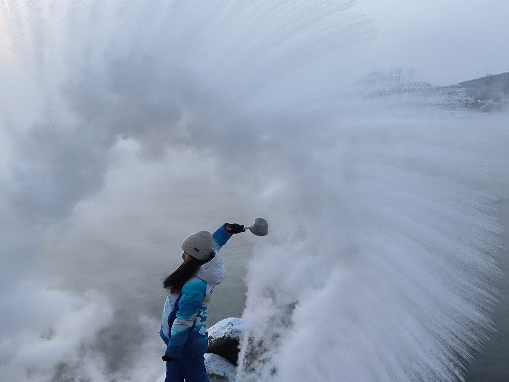 无论是否出现雾淞,早上的阿什哈达路段都很热闹,这里仿佛是个小集市,可以买咖啡热饮,路上边还有新建的公厕,在这里还可以看到“泼水成冰”景观,这是严寒天气下东北特有的一种现象,当热水被洒向空中,周围的水蒸气迅速降温凝华,直接由气态变为固态,在空中形成根根分明的线条,热水与空气的巨大温差是实现泼水成冰的关键,泼出的热水会形成无数小水滴,在低温下形成小冰晶,实际上“泼水成冰”中的冰并非水结冰,而是水形成水蒸气之后,水蒸气在极端寒冷空气里凝结成水滴或者凝华成小冰晶。