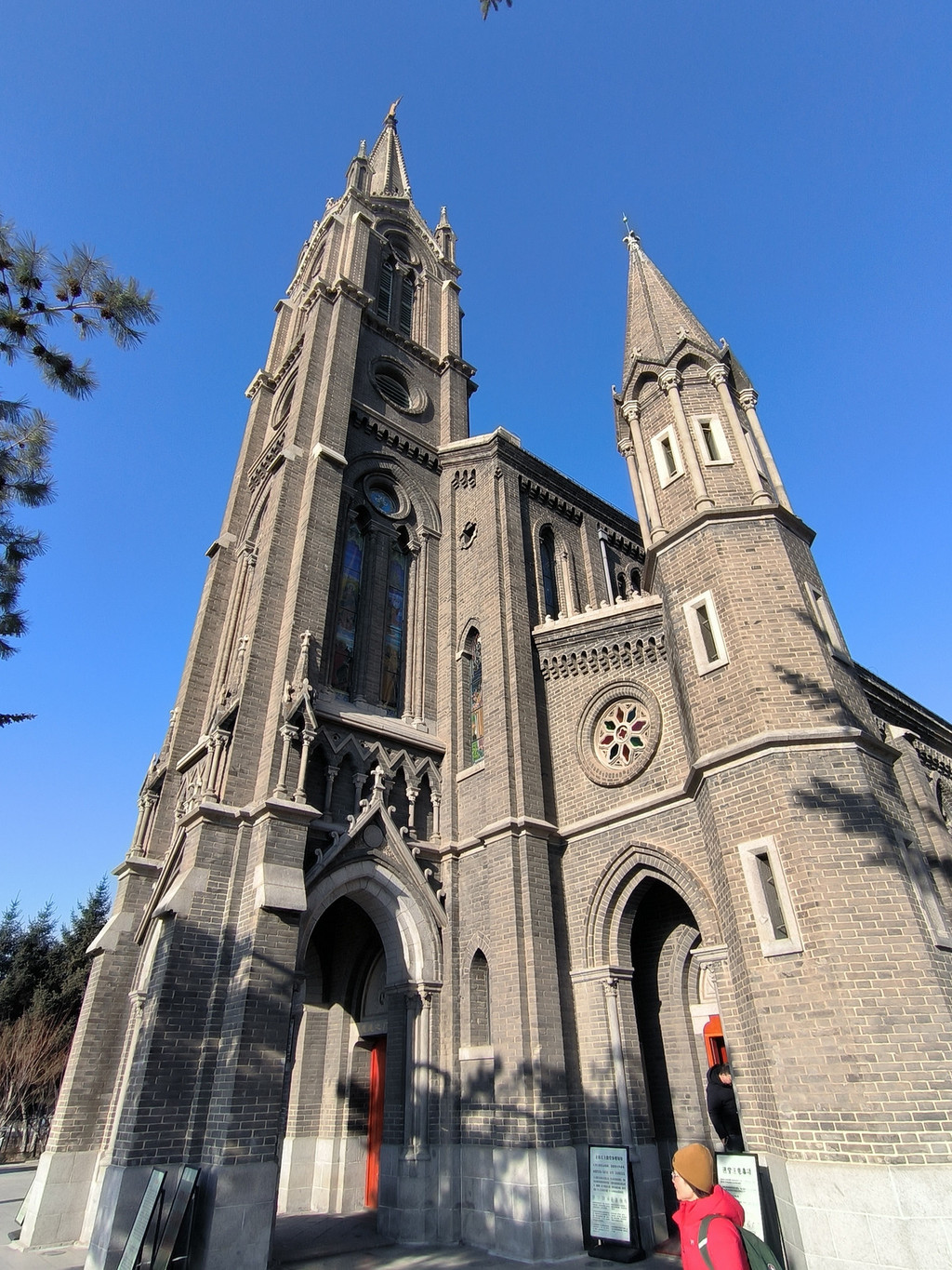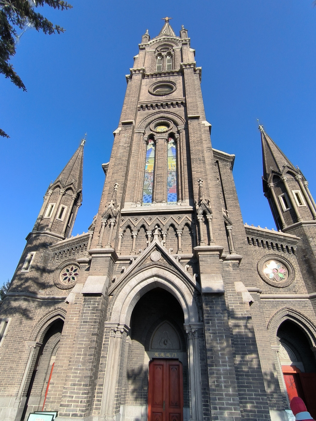 离开文庙穿过江城广场,我们来到吉林大桥头的江边天主教堂,这是一座典型的哥特式建筑,教堂前部有3座尖塔,中间的主塔高达42米,为教堂的钟楼,这种建筑风格始创于法国北部,十二至十五世纪期间盛行于西欧,取代了罗马式厚重阴暗的半圆形拱门造型,这座天主教堂正是由法国巴黎传教士筹资所建,为吉林市最早的天主教传教场所。天主教传入中国始于明万历八年(公元1508年),耶稣会传教士利玛窦抵达中国之后,清康熙二十一年(公元1682年)首入东北,十八至十九世纪初期天主教在中国遭受禁抑,除澳门等少数地区外一度中断,