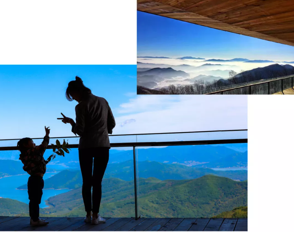徒步至森之舞台观景层,霎那间松花湖的风景和蜿蜒山林横陈眼前,大自然的美尽收眼底,体会人、建筑与自然的和谐共生,拍一张美美的照片留作回忆吧。