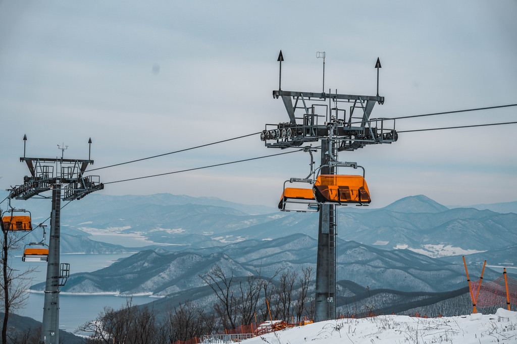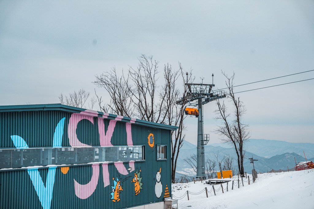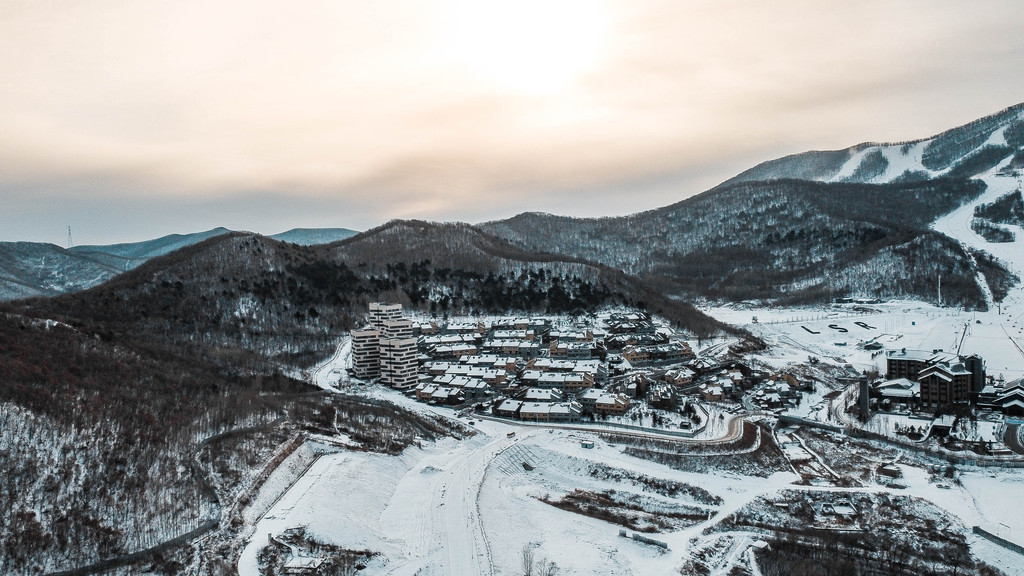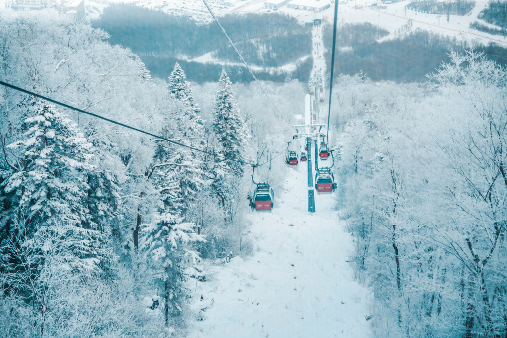 坐缆车到达滑雪场的山顶上,能看到笼罩在皑皑白雪之中的雪山小镇,还有一些网红打卡点很适合拍照。