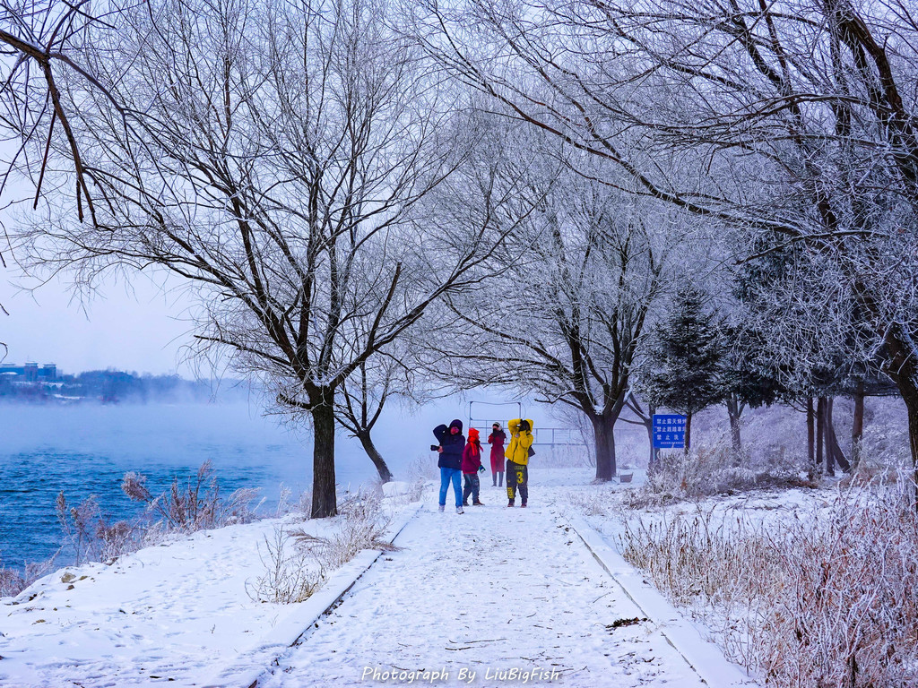 走到江边,来到阿什哈达雾凇观赏带,当被雾凇环抱,寒冷仿佛也霎时间退却。吉林市有江水环抱,冷热空气在这里相交,冬季里松花江边几乎天天有树挂,有时一连几天也不掉落。当地市民流传着“夜看雾,晨看挂,待到近午赏落花”的观赏雾凇口诀。