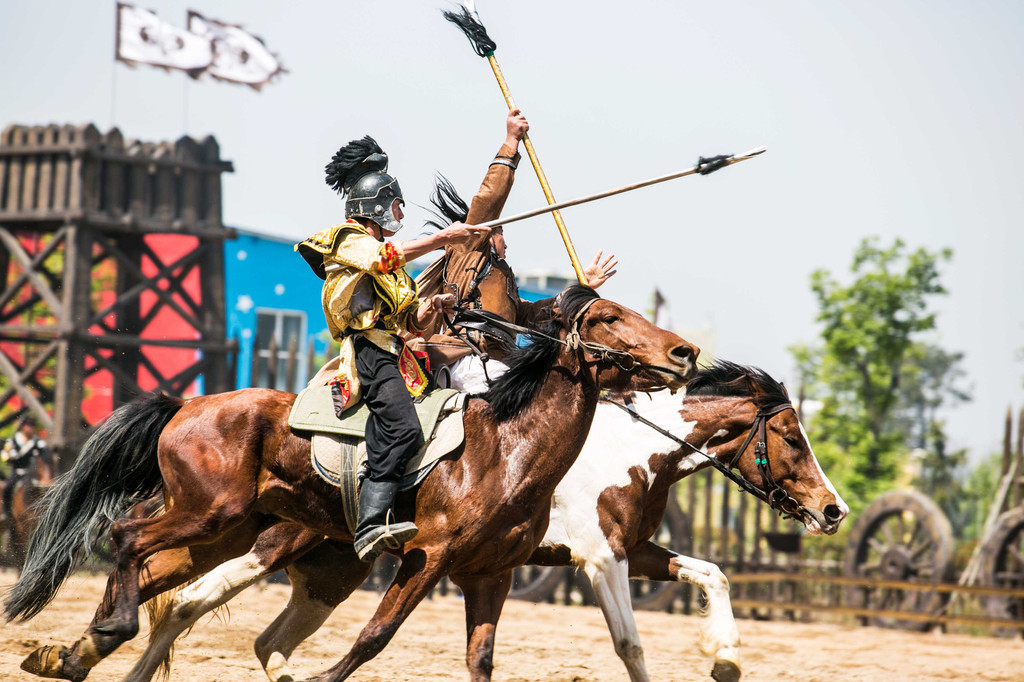马战表演再现了《成吉思汗》金戈铁马横扫战场的场景。、