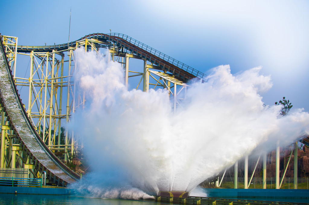 乘坐轨道车,缓缓上升至云端,再从轨道最高点一跃而下,让浪花溅起拍到到身上,十分清凉,整个过程可谓是充满了欢乐