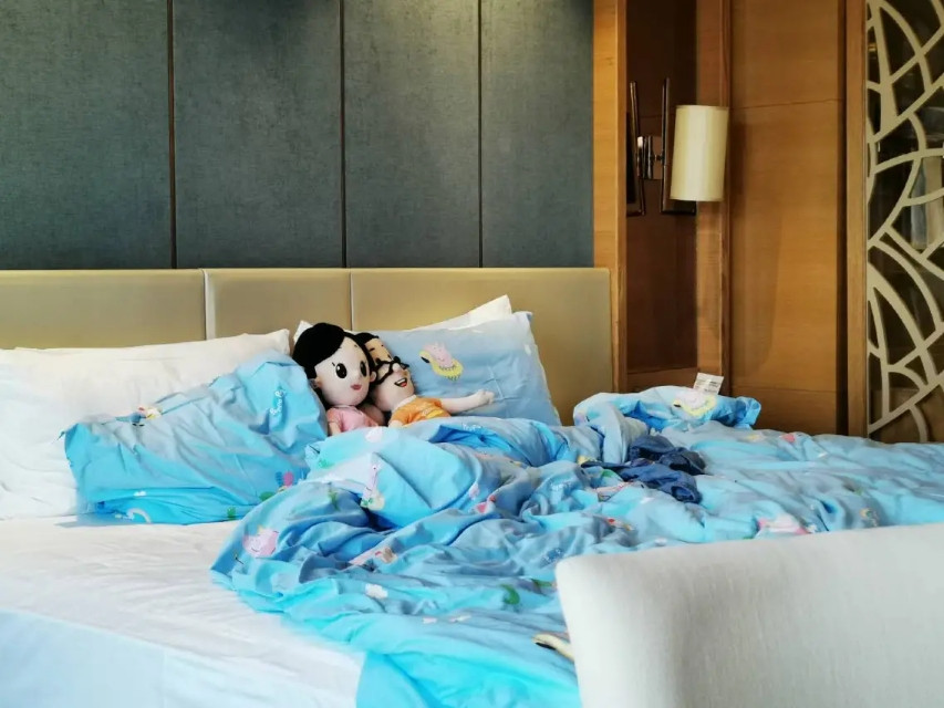 接下来是酒店大堂,特别有品味,中间的花太好看了,小姐姐比花还好看,大堂引领的小姐姐对孩子特别温柔,进了房间还在说:我好喜欢刚才那个姐姐呀,一进了房间孩子高兴坏了,一进房间就看到了床单和被罩都换成了小猪佩奇图案的,还有两个毛绒玩具。还忘记说了,前台看我们带着孩子,办理入住时还给了儿童的牙膏牙刷还有拖鞋,还有水果,关键还有给孩子的糖果、,