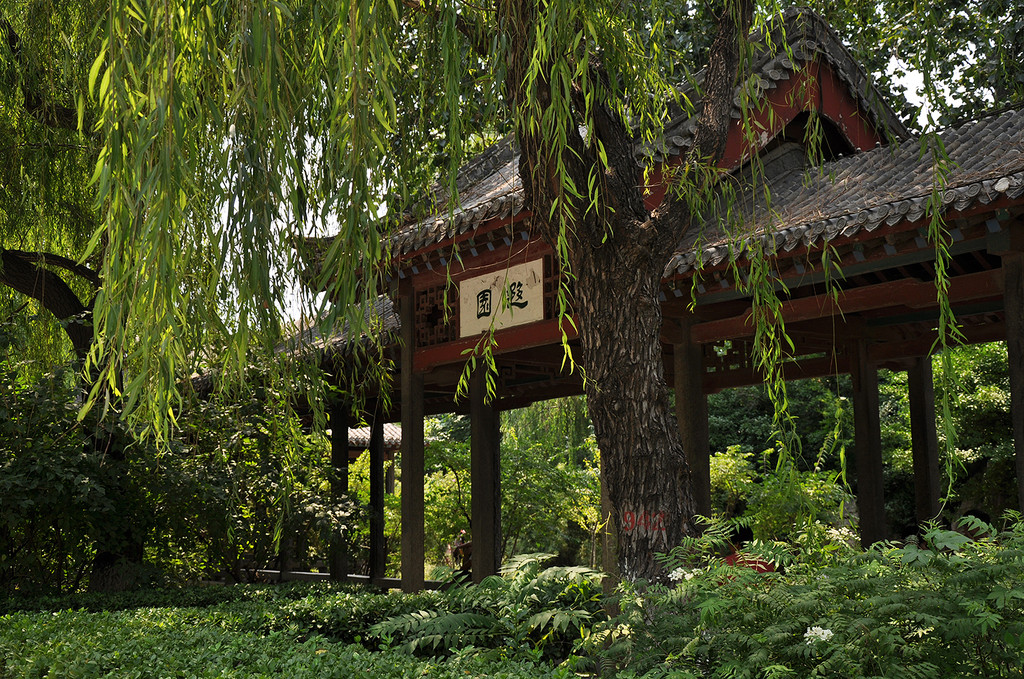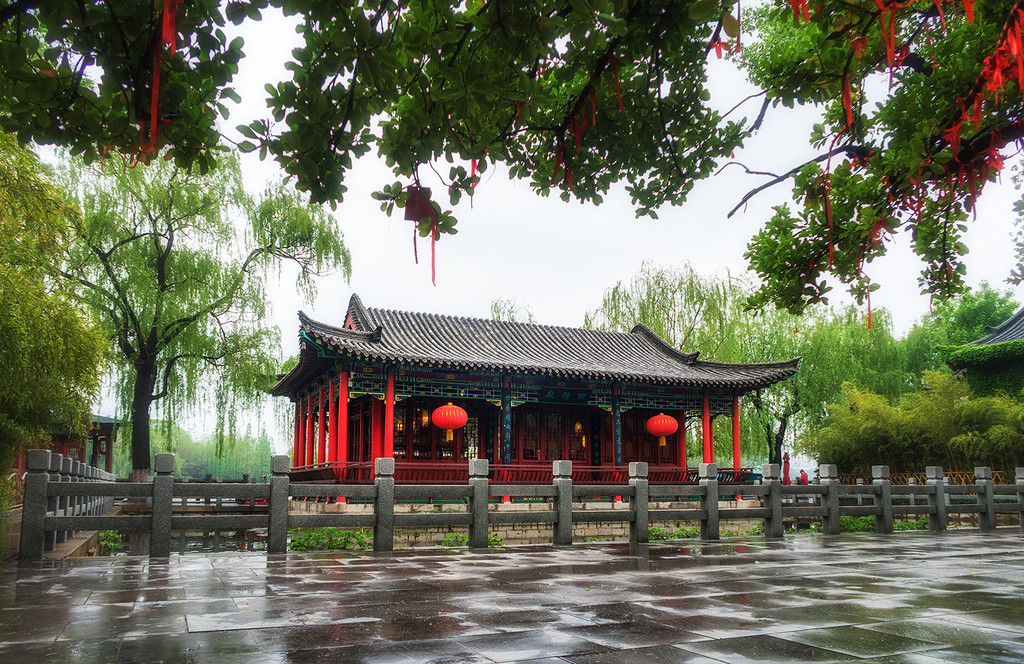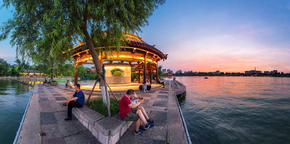 沿湖岸北行,经烟波桥、游乐场、鸳鸯亭,又是一处红莲荷区,却与藕香榭的红莲展现着截然不同的姿态。从岸上由南向北望去,大片的明湖红莲在水中随风摇曳,岸边垂柳与湖水从旁衬托,隔岸山水湖光尽收眼底,甚美。