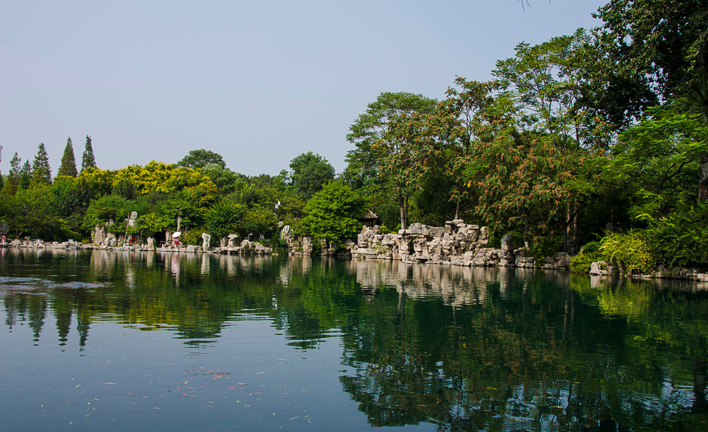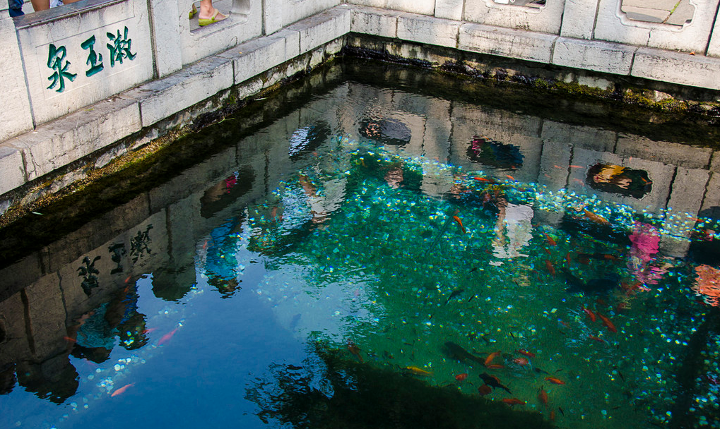 沿着汩汩流水,一路向北,从趵突泉公园北门出去,斜对面就是五龙潭公园。五龙潭也是济南的一处名泉,名气比不上趵突泉,游客数量也少得多。五龙潭的这一片水池却要大得多,俨然是形成了一座湖,湖边的阁楼可以上去赏景。湖光山色全都出自这一片水面,公园内树木葱翠比之趵突泉尤胜之。龙潭观鱼是五龙潭公园的一处美景,生活在五龙潭的金鱼体态肥大,成群结队的等候在游客面前。