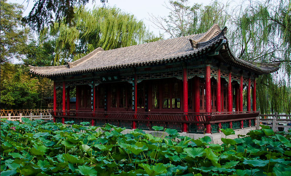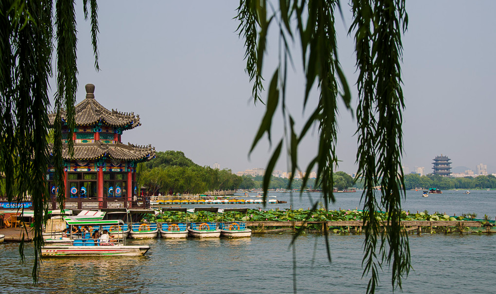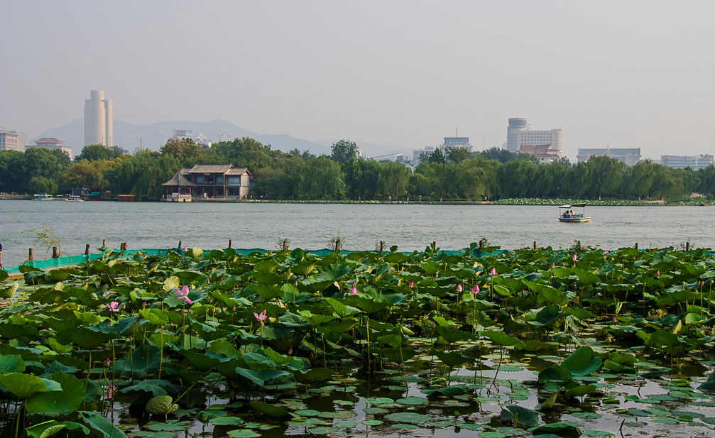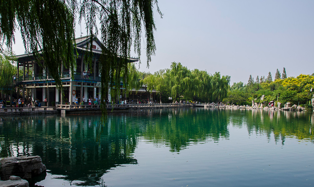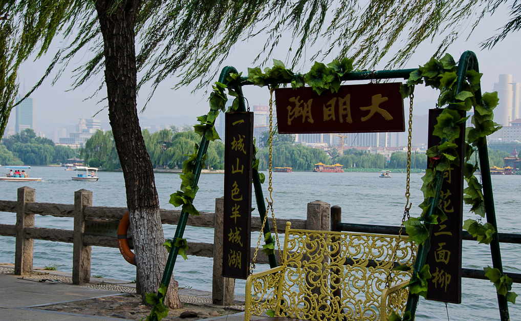 从五龙潭公园东门出去,一直向北步行10分钟就到了大明湖。大明湖位于济南老城区的北部,一个城市,有这么大一座湖,是非常幸运地。大明湖与济南老城区的护城河连在一起,湖面上种植了很多荷花。当然最多的也是垂柳,湖面上有很多游船可以玩,大船小船价格都不相同。