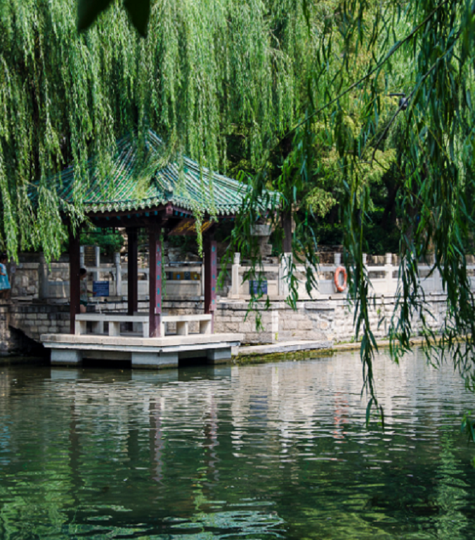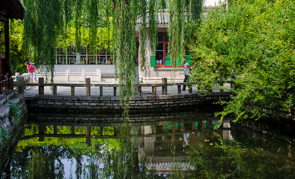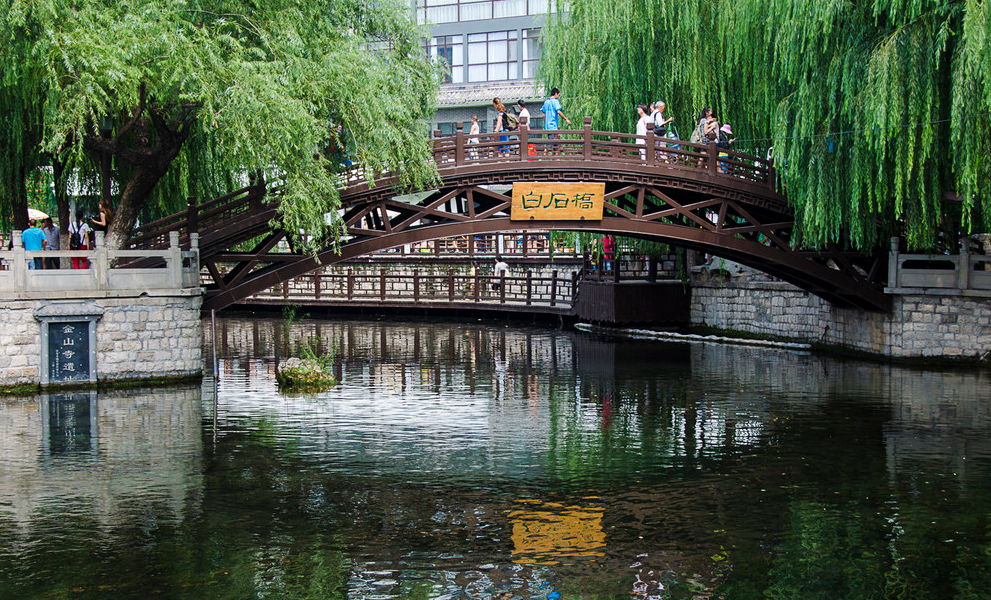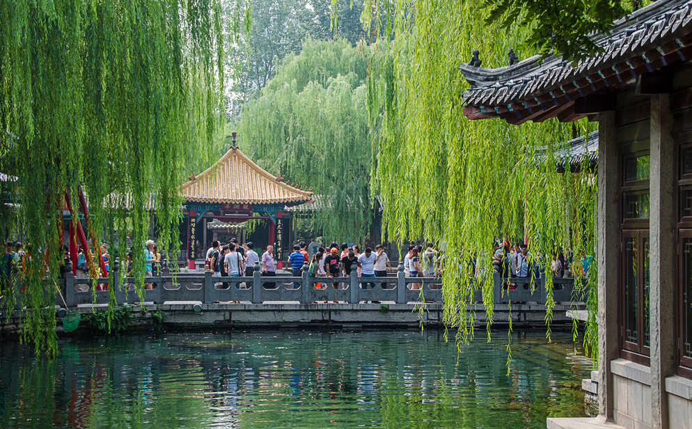 趵突泉自然是整个公园的焦点,位于水池中间的三股泉水常年喷发。趵突泉为泺水之源,泉水一年四季恒定为18度。这里的水,清澈甘冽,偌大的水池一望见底。印象最深刻的,还是处处可见的垂柳。“四面荷花三面柳,一城山色半城湖”,这两句诗是清代诗人刘风浩称赞老济南城的景象,柳树自古以来就是极多。公园内处处是水,不像是一座北方的城市,水面平静如镜。水边的凉亭内坐满了当地老人,一派恬静的生活景象。