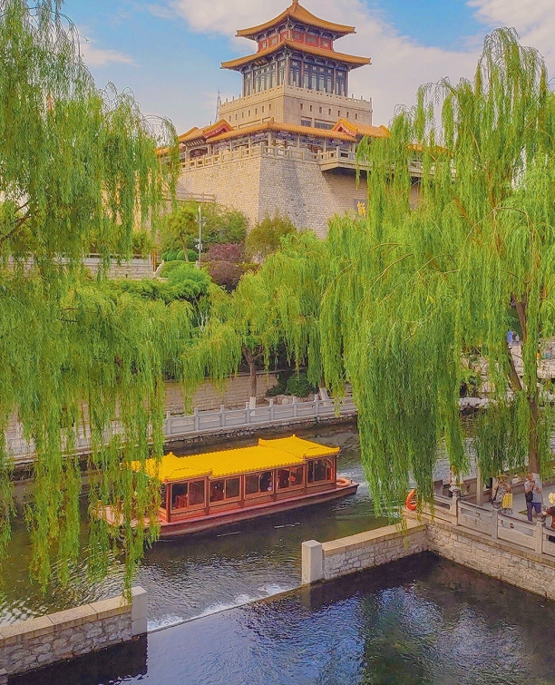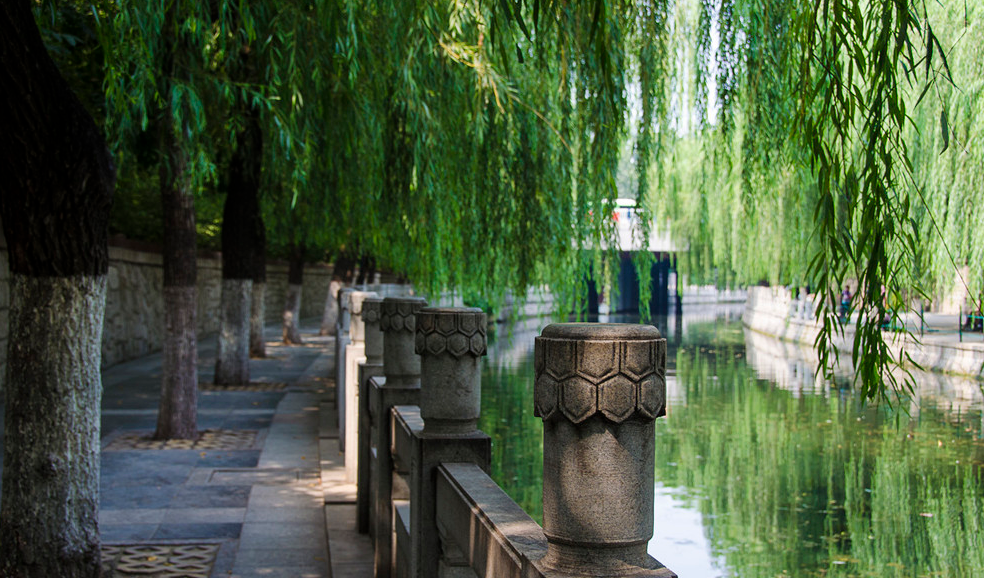 护城河的东段,环境幽静,沿着河边都是整齐的垂柳,枝叶茂密遮挡住了阳光,行走在河边一点都不觉得热。河边除了高大的柳树,还有很多水生植物,宛如一座湿地公园。建有不少小亭子,增添了人文气息。