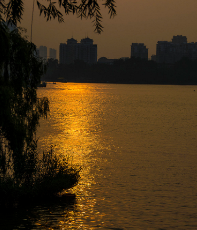 傍晚时分,夕阳泼洒在水面上,金光闪闪。大明湖的日落也是泉城一景