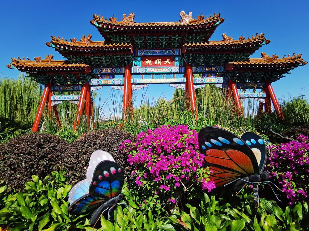 岸边垂柳纷披,园中鲜花遍布,亭台端庄,远山近水与晴空融为一色,犹如一幅巨大的彩色画卷。照片摄于大明湖。