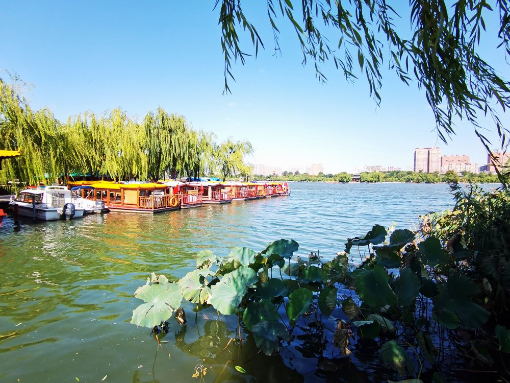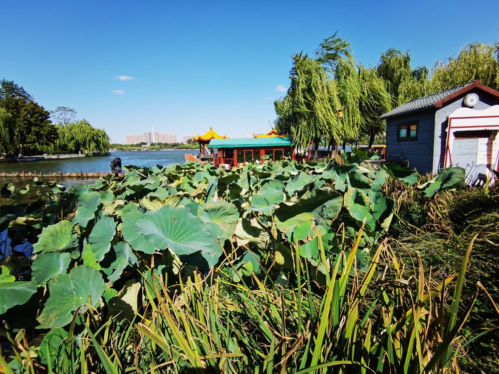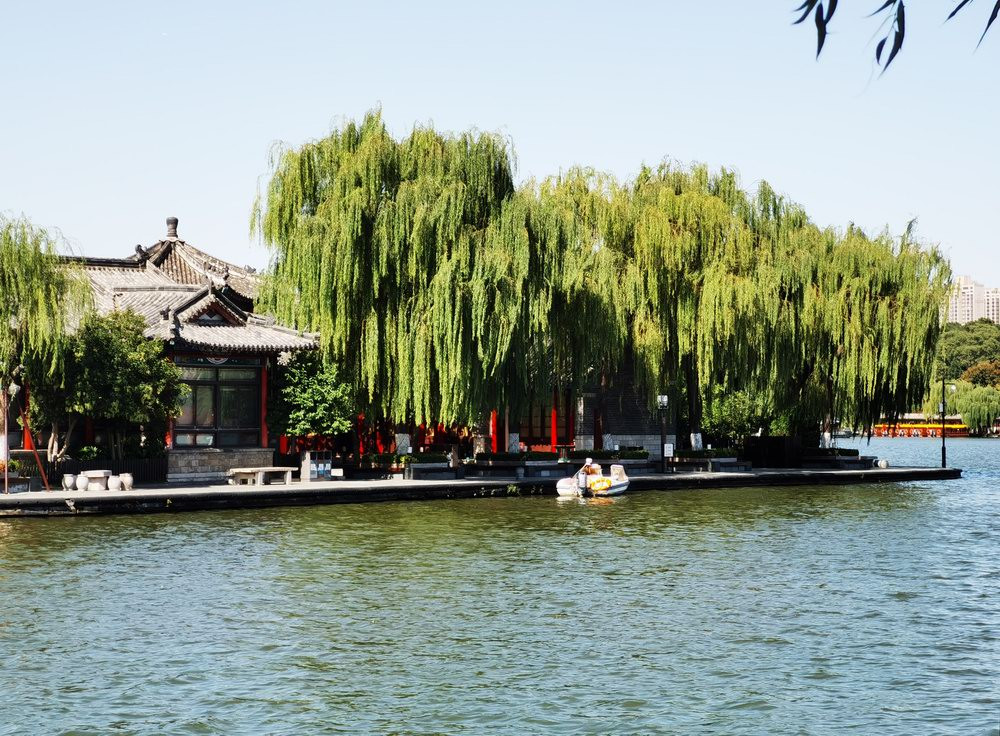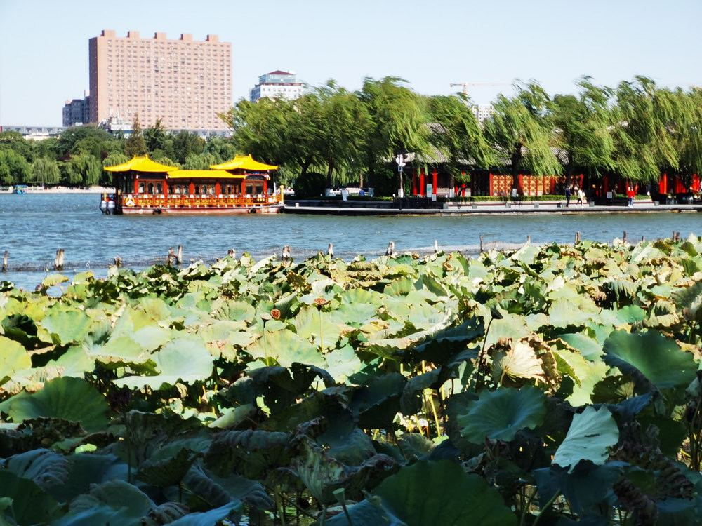 大明湖位于市中心偏东北处、旧城区北部。现今公园面积八十六公顷(1290亩),湖泊约占百分之五十三。照片摄于大明湖。