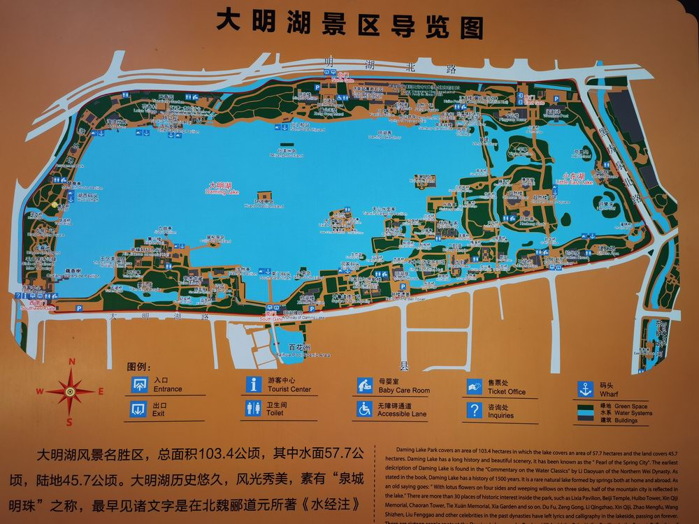 大明湖集水域风光、古园林景观、古道观、古水工、纪念性建筑为一体,具有深厚的文化积淀和高品位的旅游资源。为天下第一泉国家 AAAAA 级旅游景区。图为大明湖的导览图。