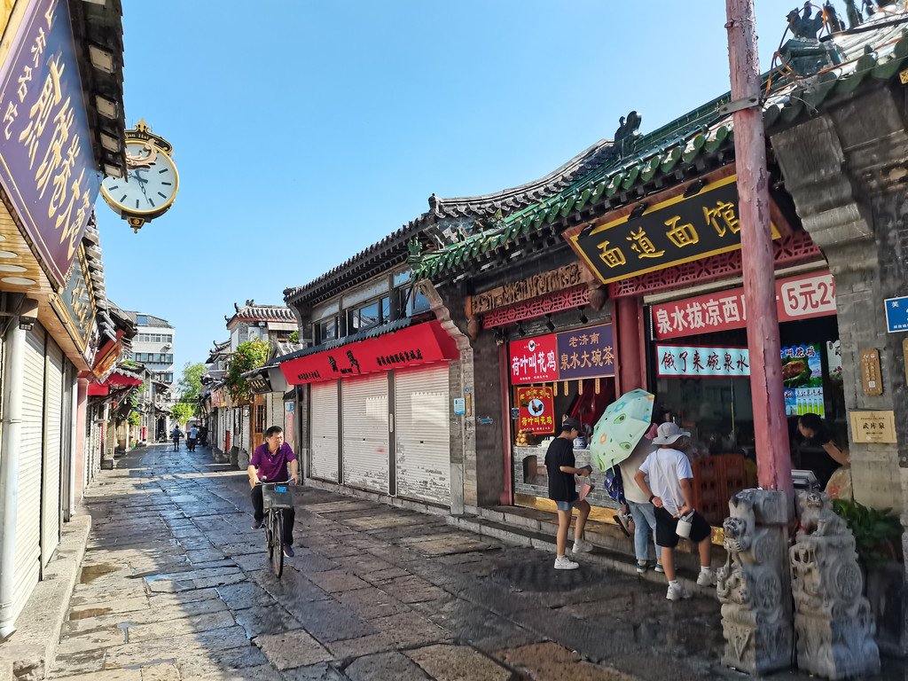 芙蓉街和百花洲离住的酒店很近,所以慢慢步行走过去,正好在芙蓉街吃早饭,体验当地特色早点。查看地图,从昨晚走着比较渗人的待改造老街可以一直走到芙蓉街,正好逛逛济南的老街巷子。