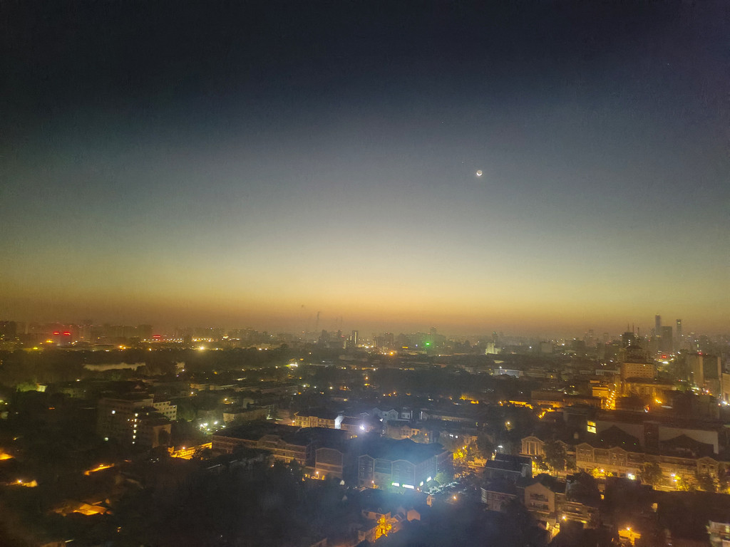 天还没完全亮,能看到远处的晨曦,还有一轮月亮挂在天空,清晨的济南晨曦合着灯光,从酒店窗户拍过去,非常美丽的景色。