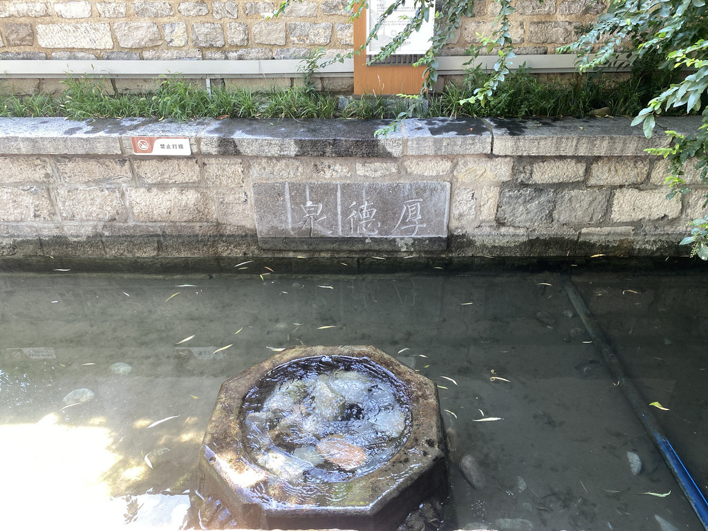 厚德泉:在百花洲东南岸。此泉原为无名泉,2009年被命名为“厚德泉”。泉池呈井形,池口为石砌,井壁为砖砌,直径0.45米,深0.7米。泉水出露形态为渗流,长年不竭,积水成井。