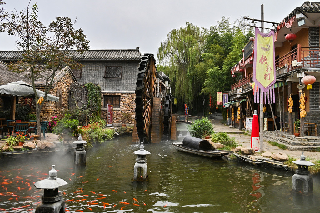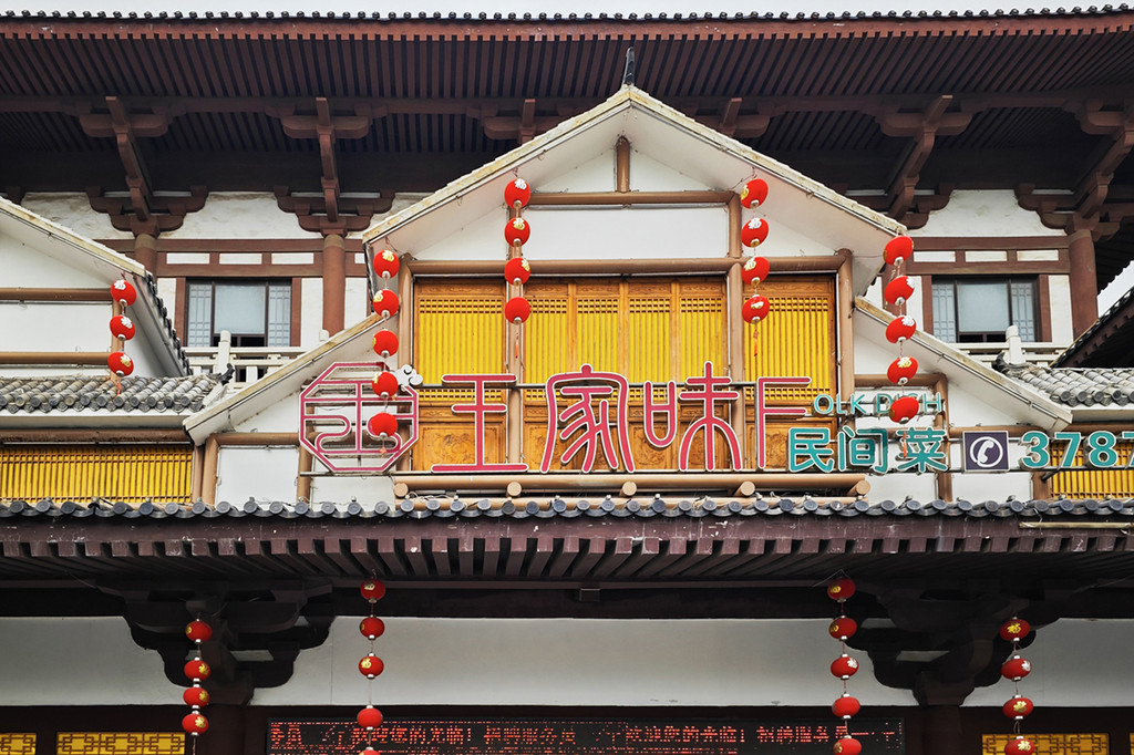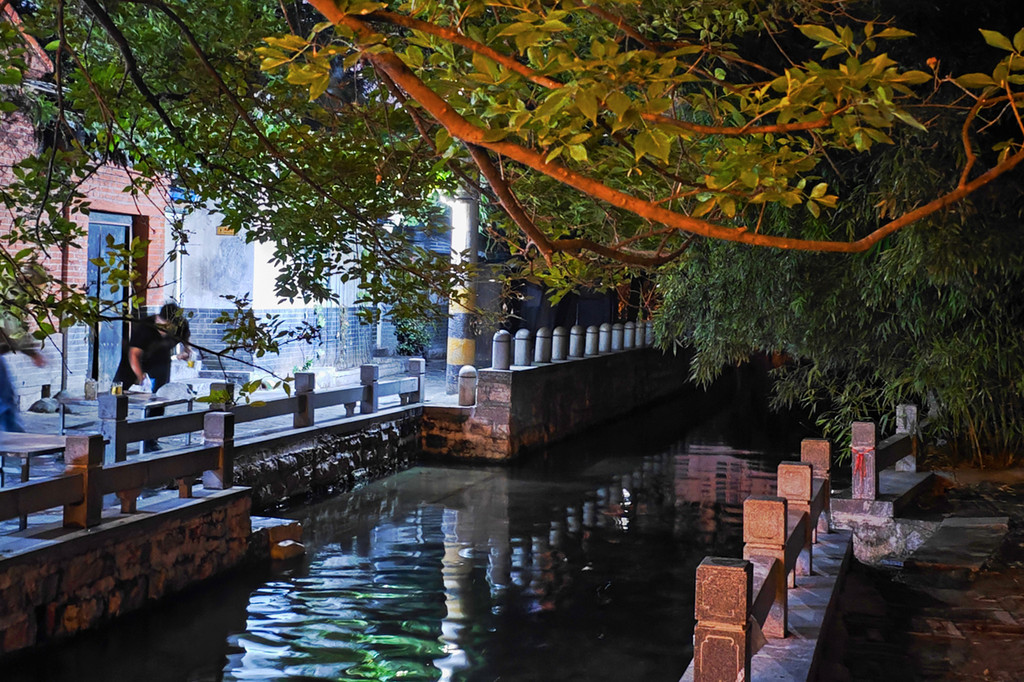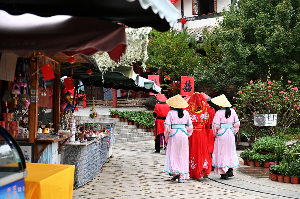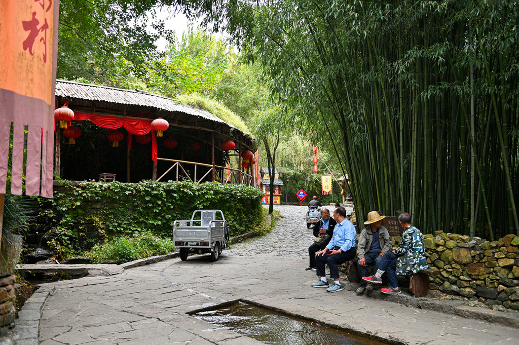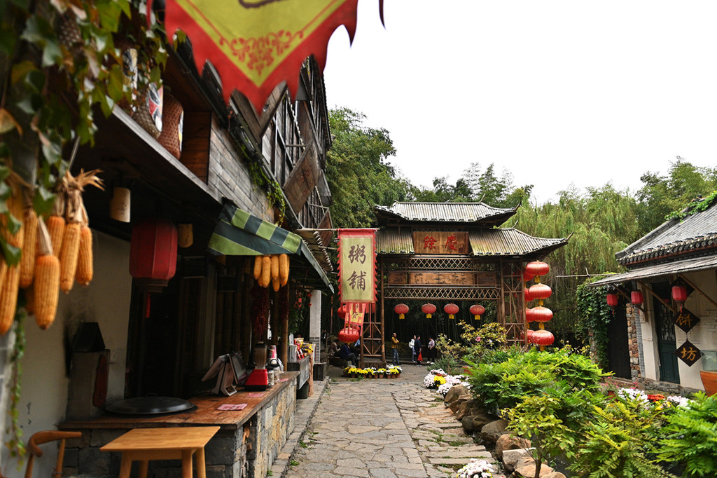 曲水流觞,檐花蔌蔌,沿着村里的青石板路向前,错落有致的古朴石屋边,清泉沽沽,竹香淡淡,街边有各种小摊,街道上各种店铺,从生活到娱乐,方便却并不喧嚣。