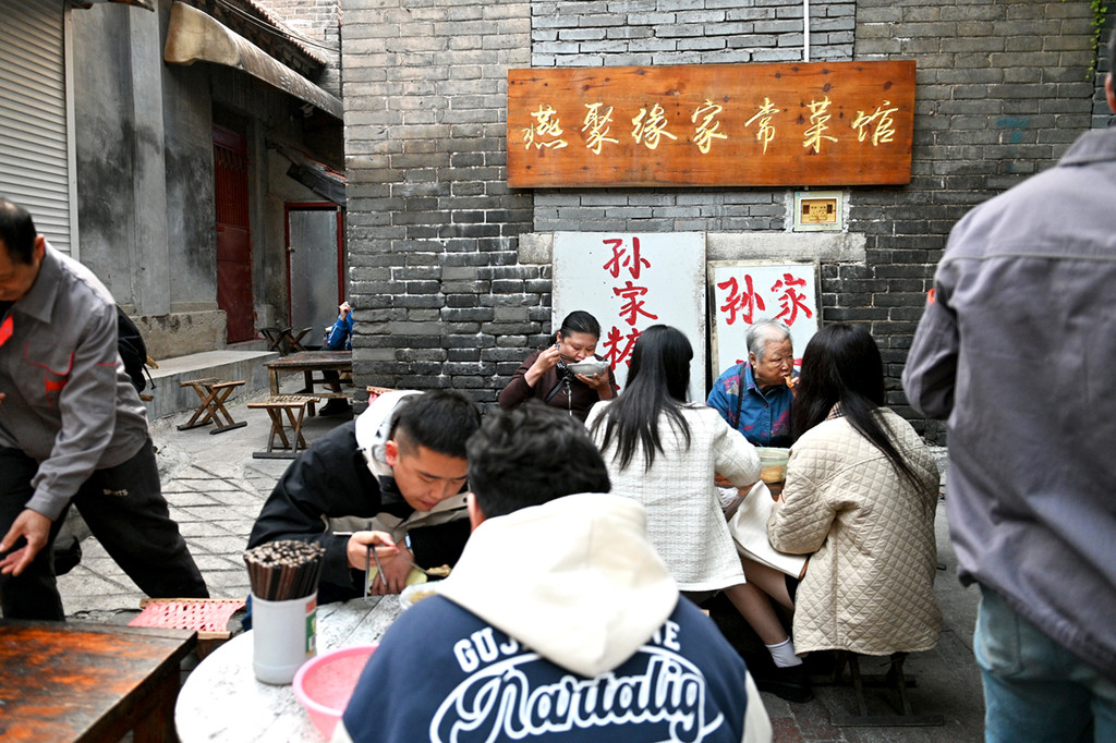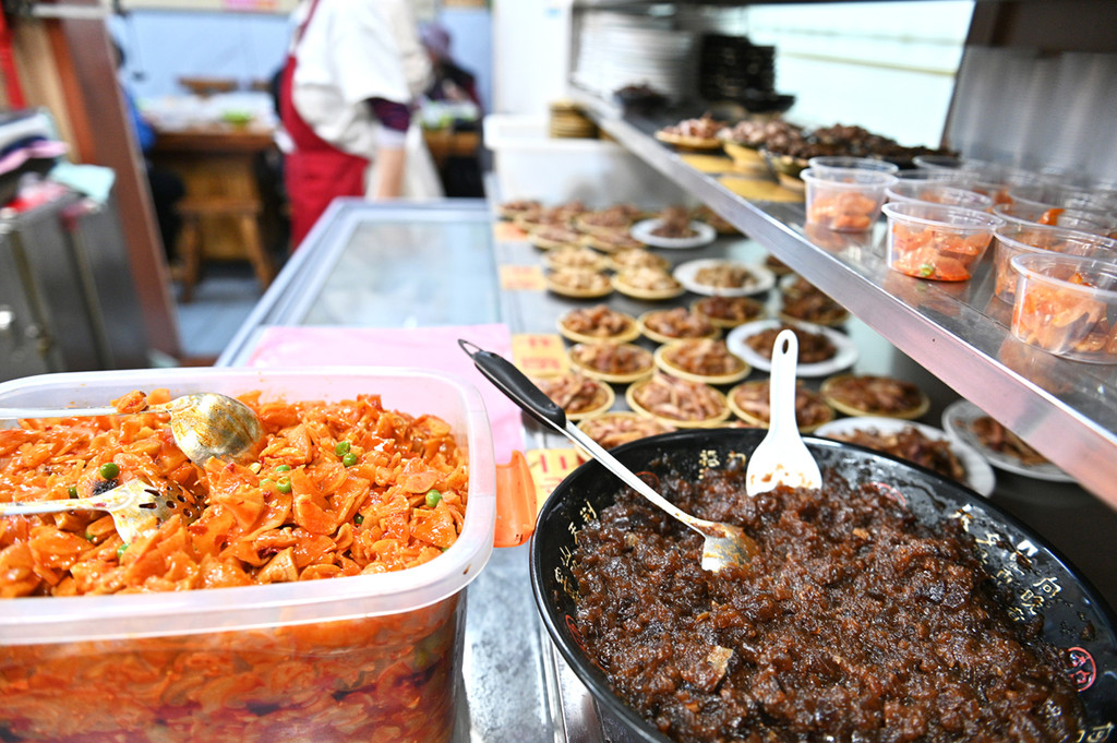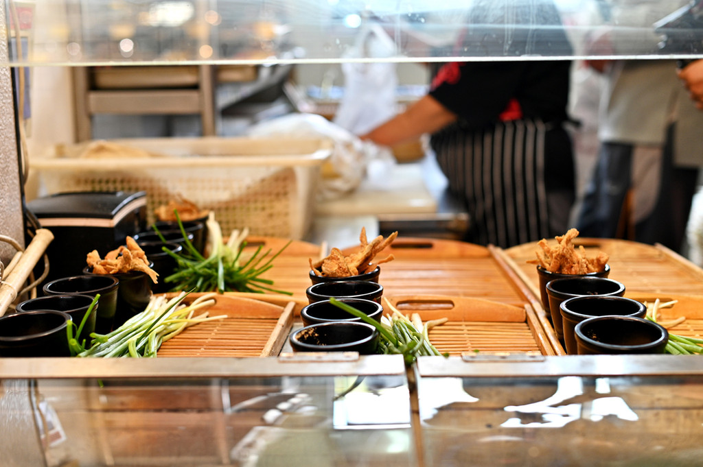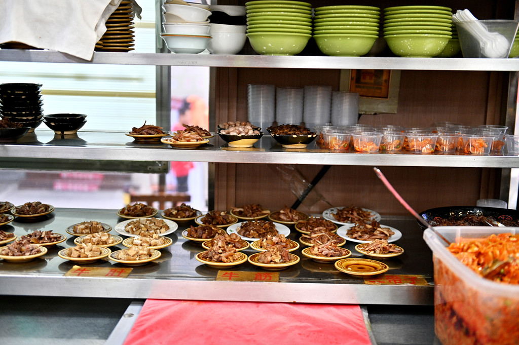 这是个藏在岱庙旁边小胡同里的、看起来极不起眼的糁馆。早餐是自助,包括油条、煎饼、葱饼等等在内的近十种主食,只需要4元钱就可以随便吃,糁也是4元一碗,还可以免费续,几种小咸菜都是可以免费自取的。反正来国华糁馆,就是说甭管你多大胃口,只要花8元钱,吃的喝的外加小咸菜,可以随意吃个尽兴。
