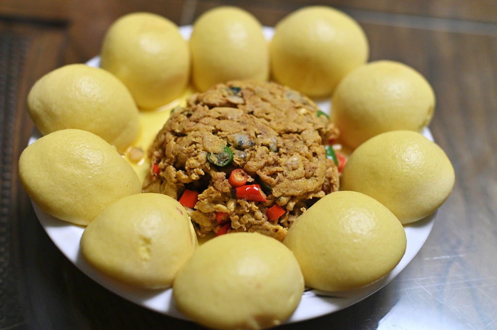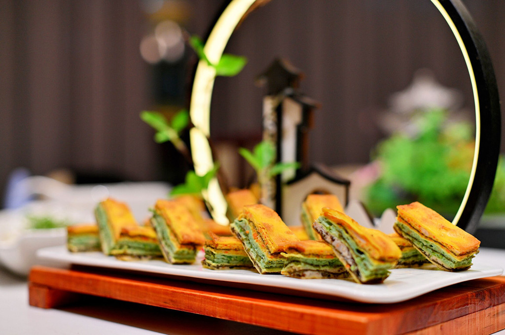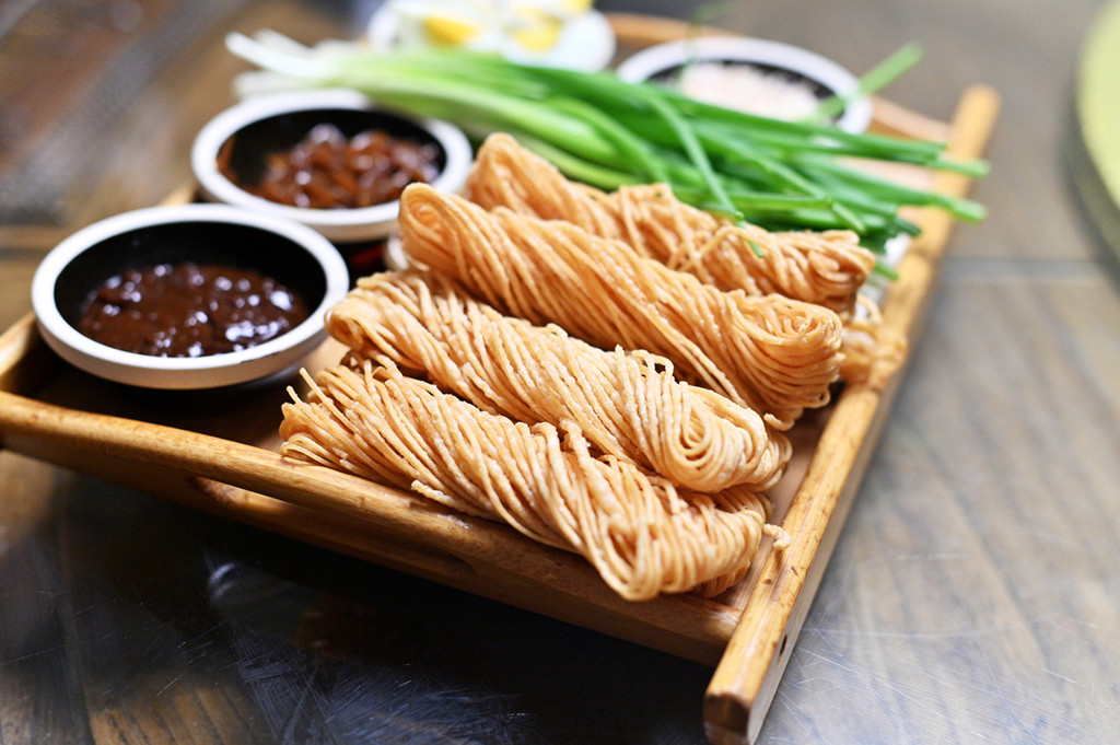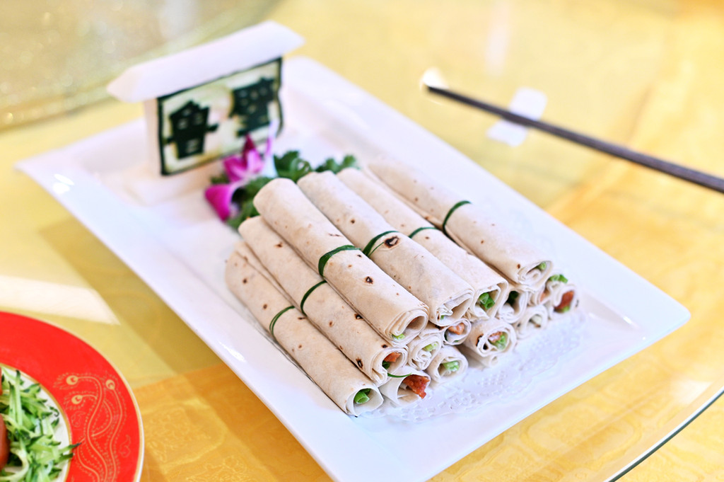 大有来头的鲁壁藏书,据载,孔子子孙为避秦时焚书之灾,将《论语》、《孝经》等儒家经典藏砌于墙壁中,才得以幸免。后人为延续孔府文化精神,于是创造了这道菜。现在的鲁壁藏书,小饼里卷着肉和葱,状似竹简书卷,口感酥香。