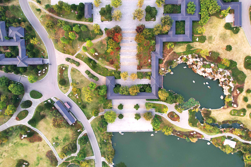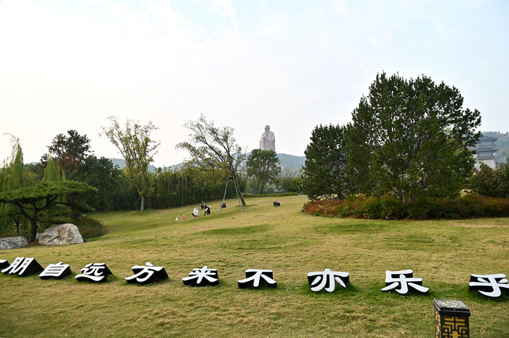 下车点离主建筑大学堂很近,绕湖前行,好像也就十分钟左右的距离,而且一路景色都很美,湖围着建筑,步道上也设计得可可爱爱。从这里也可看到景区的最高点,高72米的孔子像。