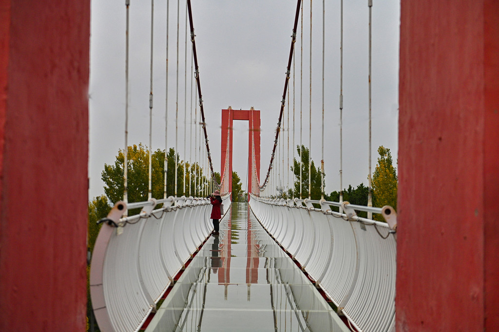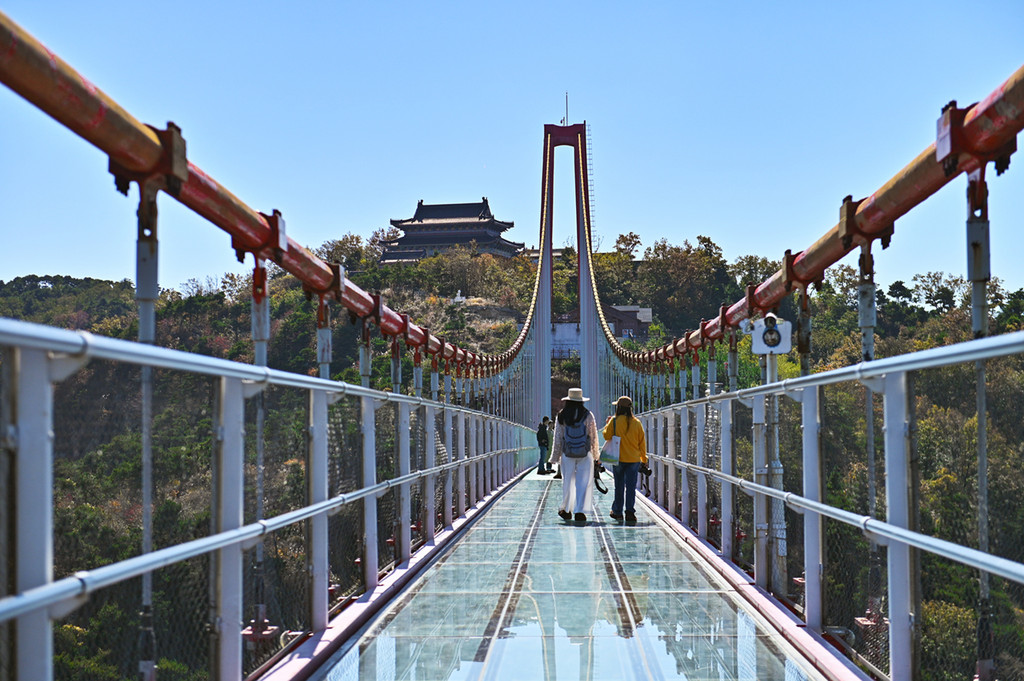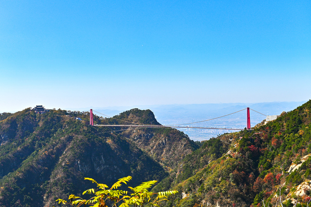 山顶索道站旁有望海楼,可以俯瞰整个峡谷。顺着栈道向前,可以看到远处山间的玉皇宫。连接玉皇宫和望海楼两个重要景点之间的交通要道上,会经过天蒙山悬索桥。这座桥全长505.5米,主跨420米,是世界最长、跨度最大的人行索桥之一。天蒙山悬索桥上,可以欣赏到高山、丛林之美,如遇云雾天气,应该能美成仙境。