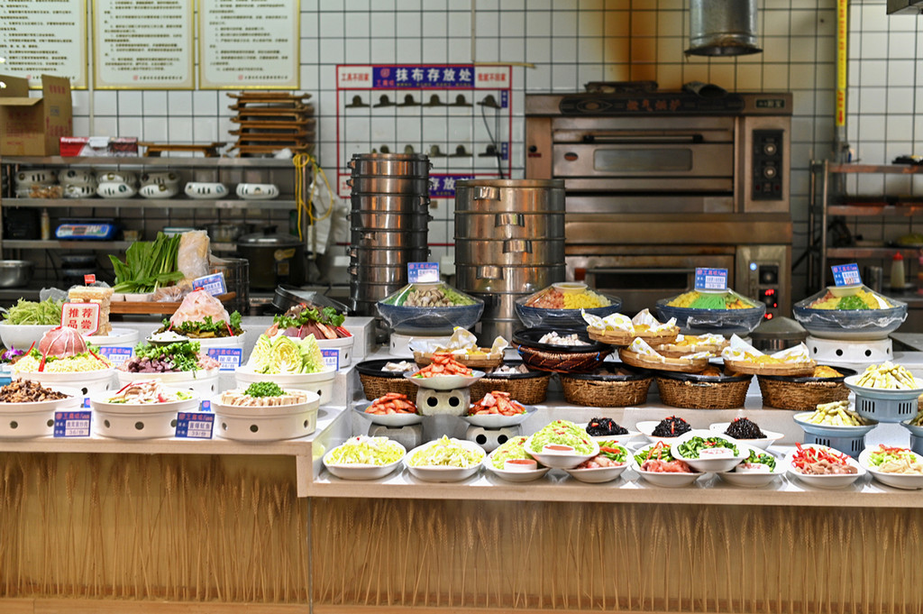 进门就能看到前厅满布的菜肴,有的只是配好菜,有的已经做成半成品,全部陈列在一块,待食客点好餐,明堂里可以看到操作过程,作为一个家常菜馆,这波操作实在是赚好感。