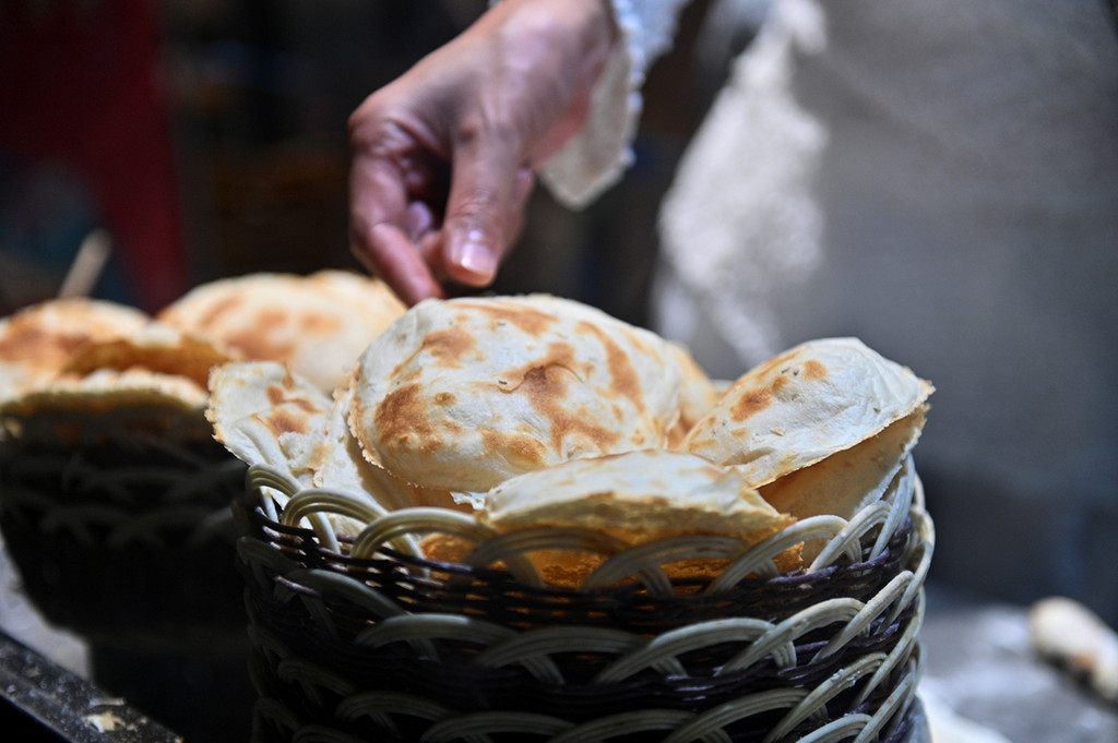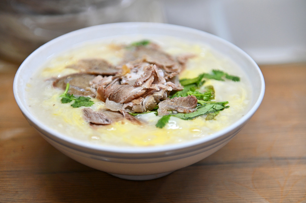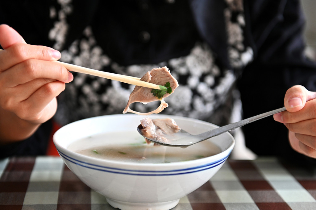 敲一个鸡蛋,打散,舀一碗羊糁汤冲满,再加入薄切的羊肉片,一碗羊糁汤就做好了。店里的配餐是极有韧劲的饼,一边吃饼一边喝汤,从嘴到胃,舒服。
