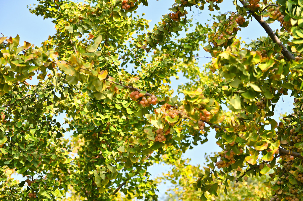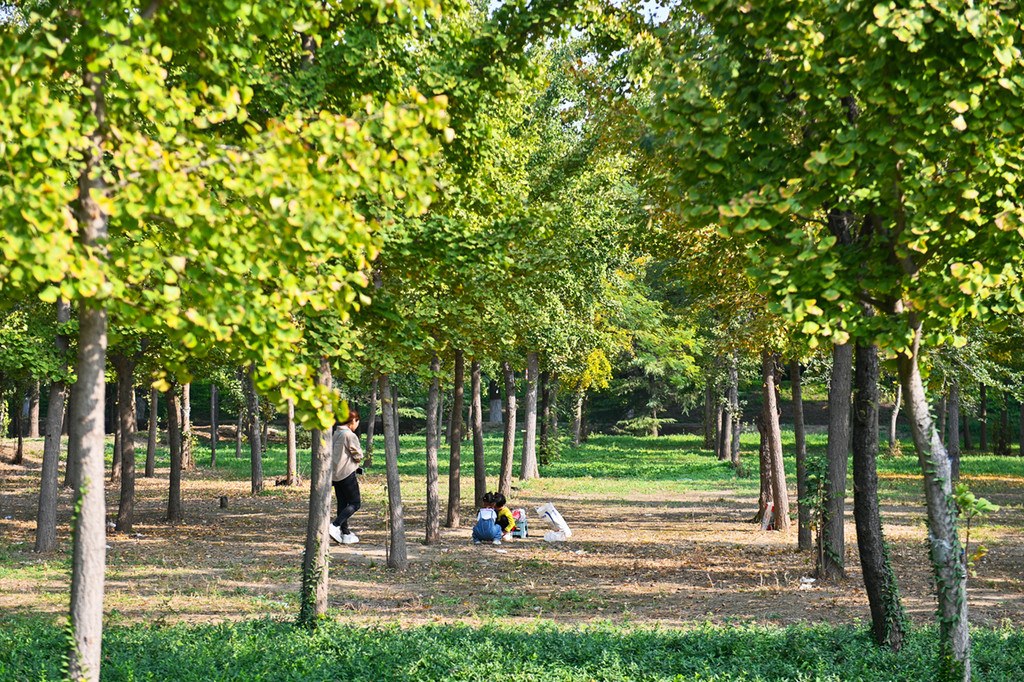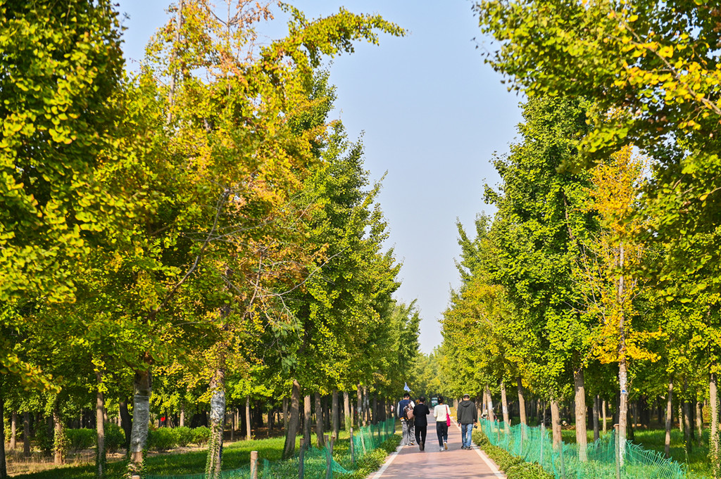 逛完市场再去赏银杏。到黄河银杏林,车可以一直开到树林边,非常之方便。这片银杏林位于黄河河务段万米堤防的一侧,据说光银杏树就有30多万株,占地1100余亩,有着绵延十多公里的银杏长廊,它几乎是黄河流域规模最大的银杏林之一,也是济南赏秋必去的地方。