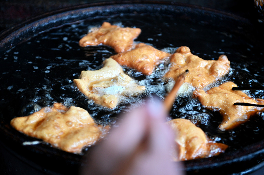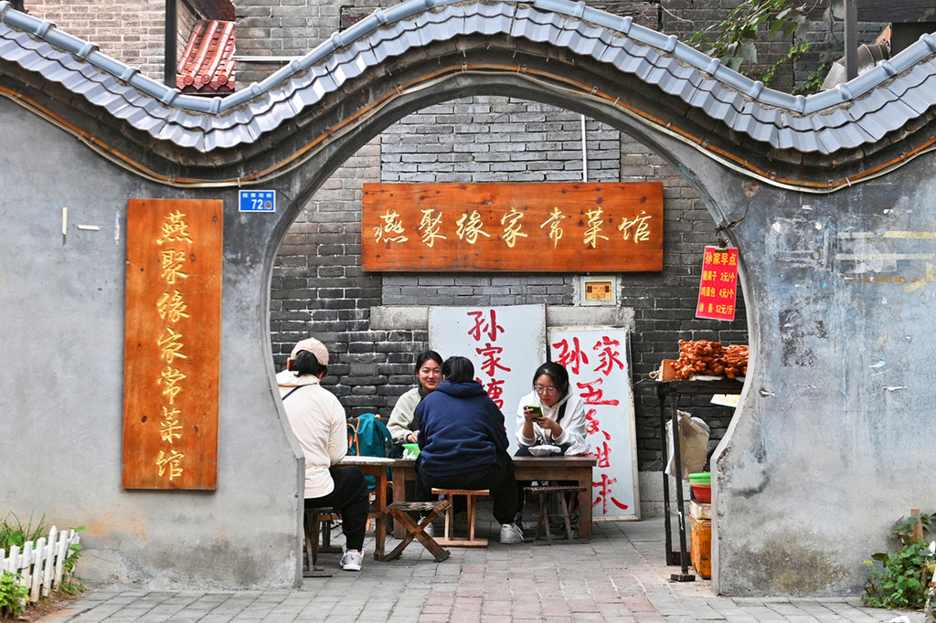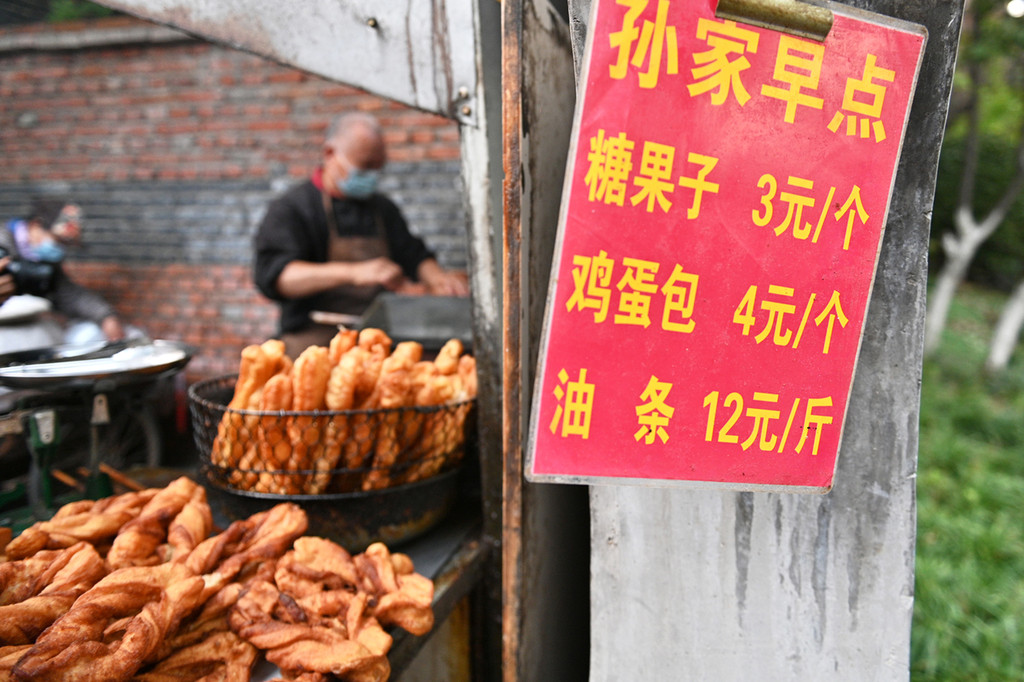特别简单的小摊,藏在一个门楼子里,里面有个小院,院里简单支了些小桌椅,现炸现卖的糖果子3元一个,糖油条12一斤,鸡蛋包4元一个,甜沫5元一碗,